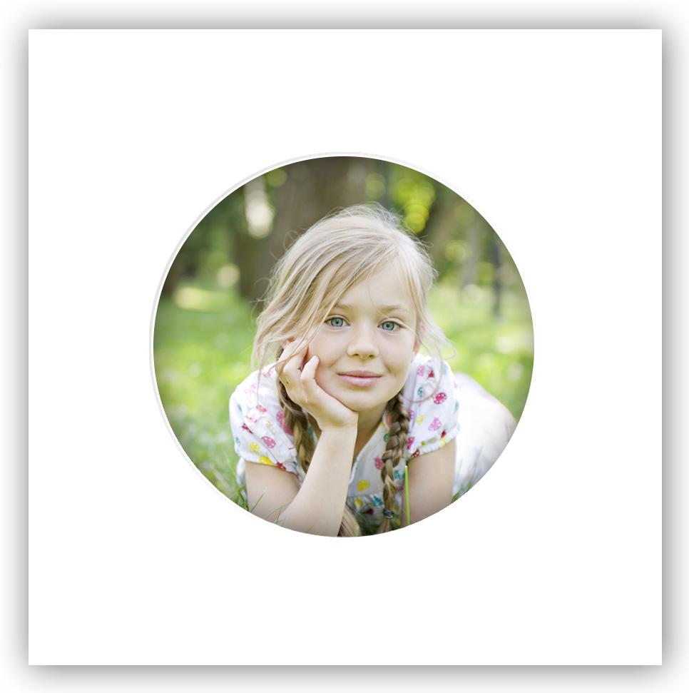 Passe-partout carré blanc sans acide avec une ouverture pour photo ronde. Convient par exemple aux portraits. Ce passe-partout est de la plus haute qualité et le fait qu'il soit sans acide n'abîme pas vos photos.