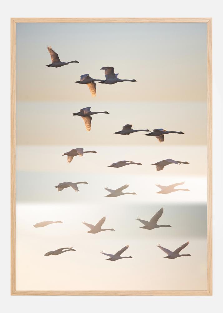 Un poster animalier d'oies volant dans le ciel coloré d’un couché de soleil. Cette image picturale raconte une histoire de migration, le tout sur fond de bleus et d'oranges magnifiques. Si vous l'accrochez chez vous, vous voyagerez avec nous !