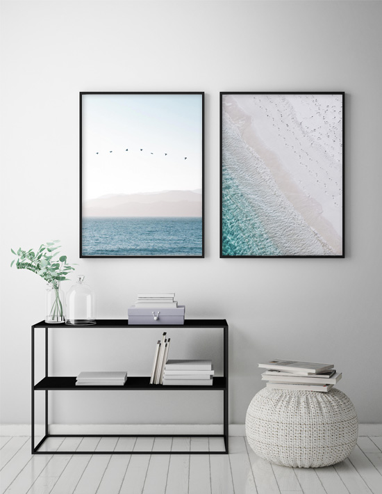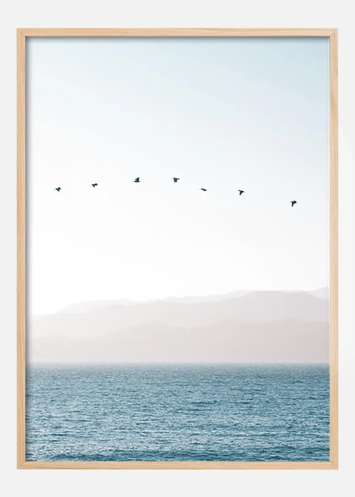 Une belle photographie de nature de oiseaux volant au-dessus de l'eau bleue contre un fond de montagnes lointaines et un ciel blanc. Un poster calme et harmonieux aux tons rafraîchissants qui convient aussi bien dans la salle de bain que dans la chambre ou le salon.