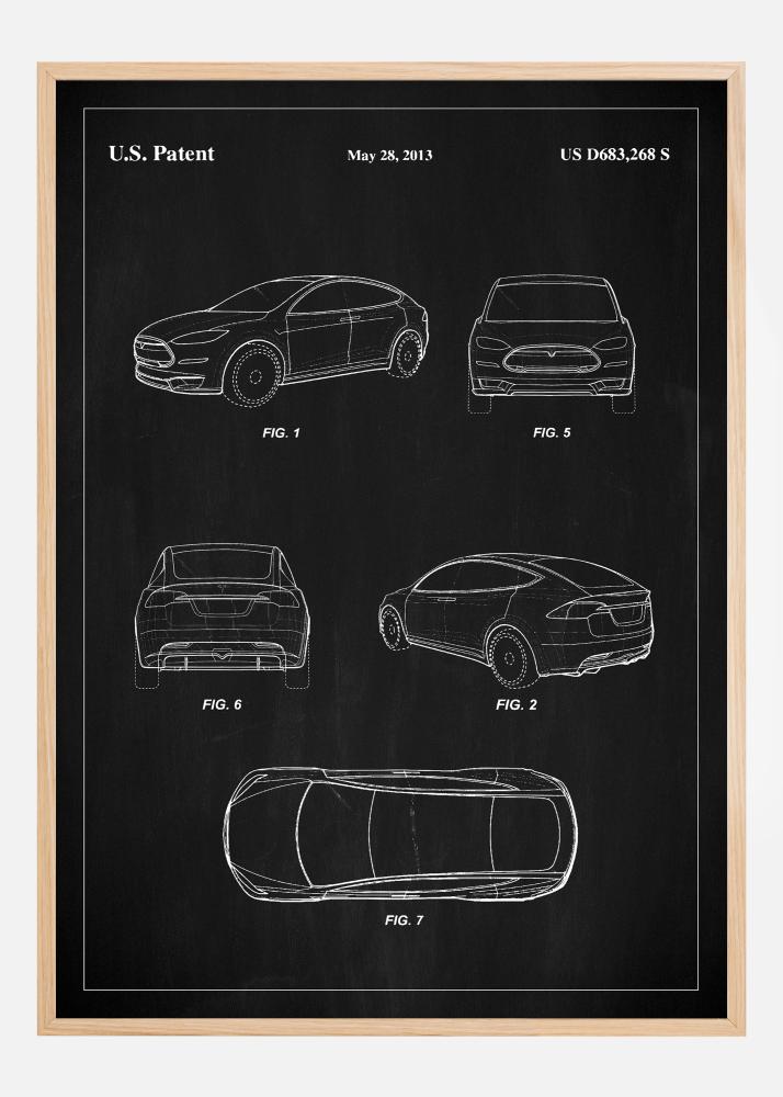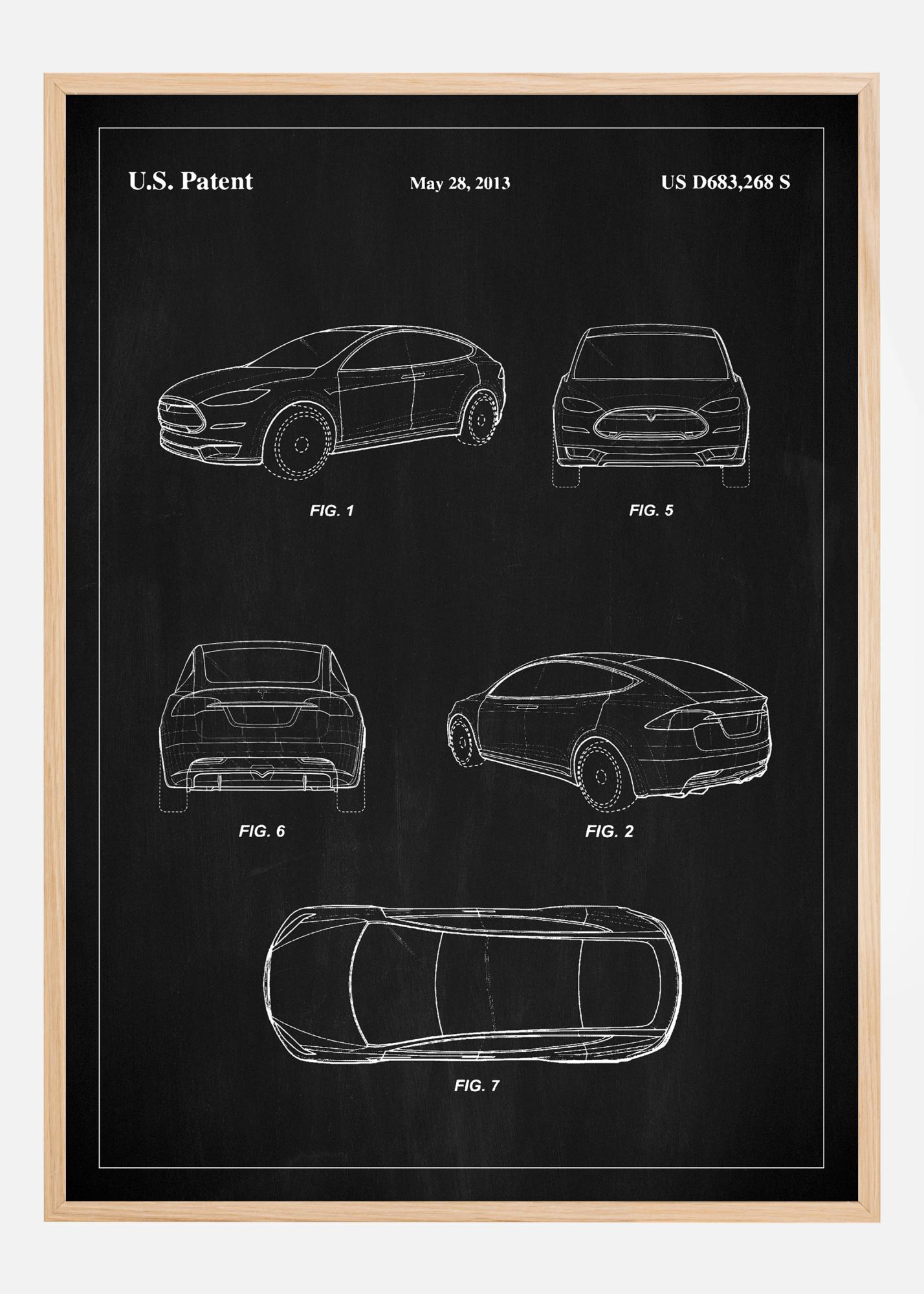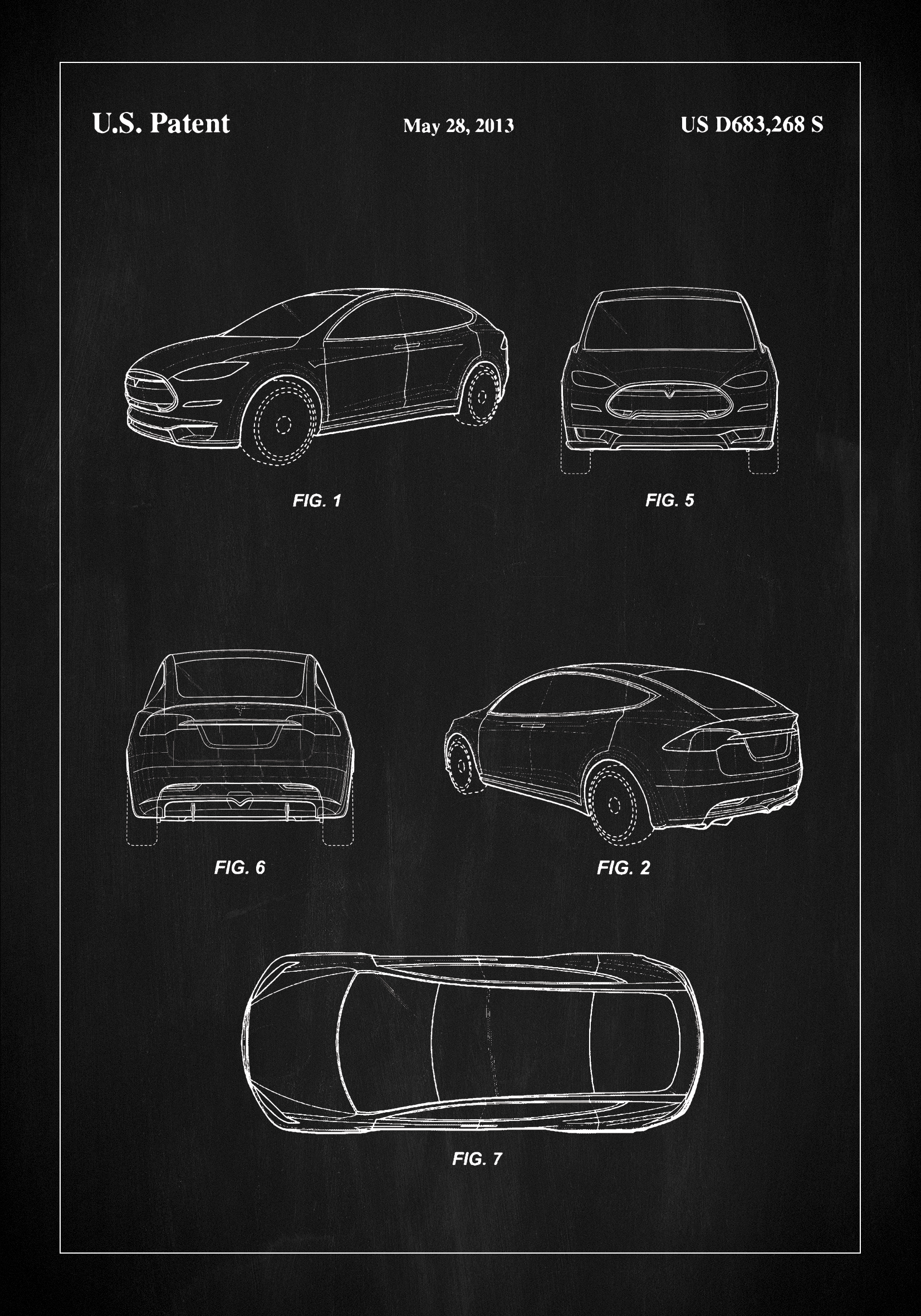 Cette affiche de brevet élégante et sophistiquée est un hommage au design automobile moderne d'une Tesla, documentée par le brevet américain numéro US D683,268 S le 28 mai 2013. L'affiche présente une sculpture de véhicule distinctive qui définit l'avant-garde de la fabrication automobile. Chaque ligne et courbe est soigneusement esquissée en blanc sur le tableau noir, créant un contraste magnifique qui capte et retient l'intérêt du spectateur.