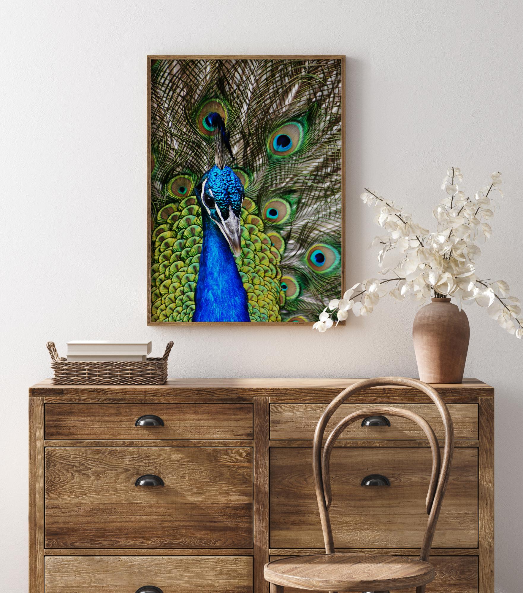Une affcihe étonnante d'un paon en gros plan. Avec ses grandes plumes de queue colorées aux motifs semblables à des yeux, cette créature flamboyante brille dans la lumière naturelle du soleil. Apportez la beauté de cet oiseau dans votre maison. Un poster parfait pour égayer n'importe quel mur nu.