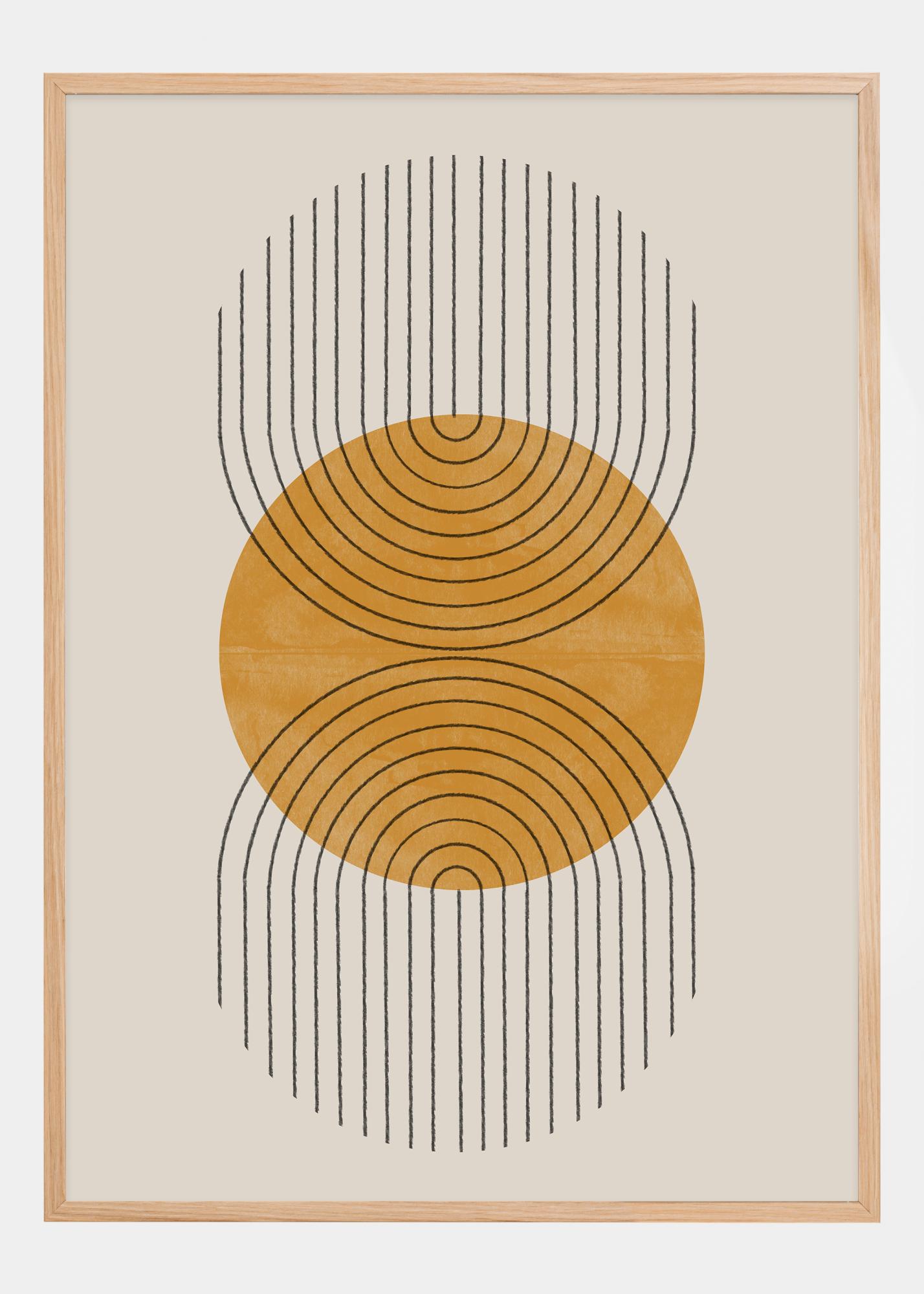 Cette affiche artistique présente une composition visuelle forte en plaçant une forme circulaire jaune doré saturée au centre, entourée de lignes noires verticales qui créent une illusion optique d'expansion et de contraction. Les cercles concentriques à l'intérieur de la forme jaune ajoutent une sensation de profondeur et apportent une qualité organique au motif autrement strictement géométrique.