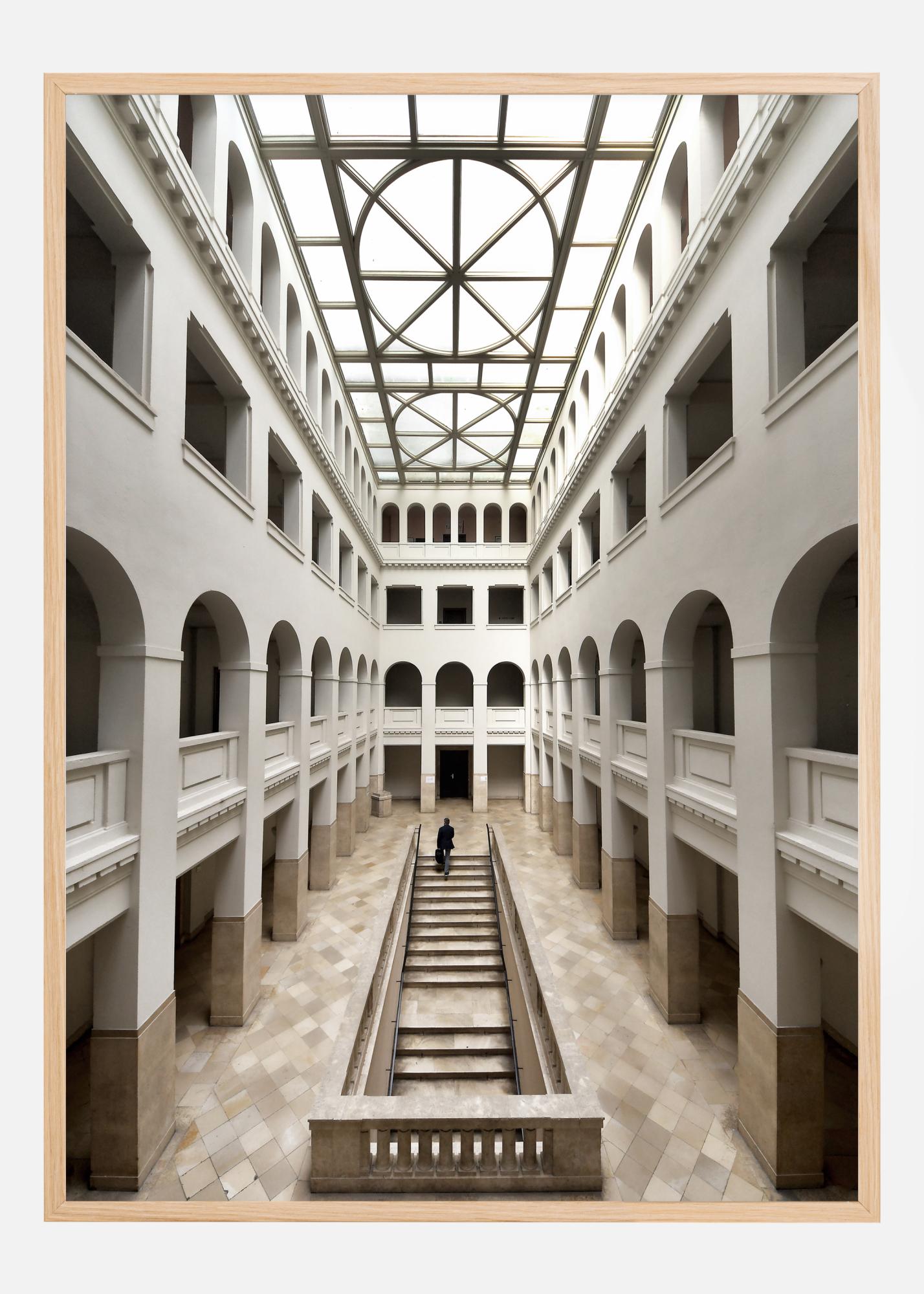 Une magnifique photo du bâtiment de Peter Behrens. Le design intérieur beige et blanc capture une silhouette qui monte les escaliers. La toiture transparente illumine le travail de l'architecture avec des fenêtres de forme circulaire et carrée permettant à la lumière de passer. Créez une atmosphère élégante avec cette superbe affiche.