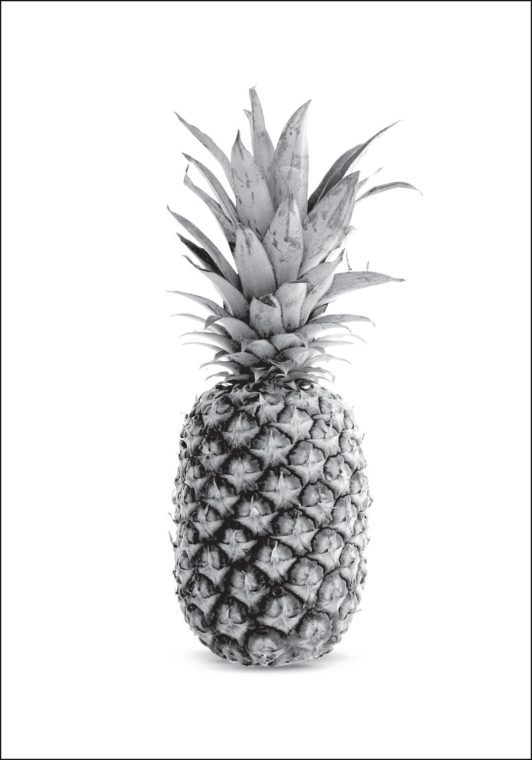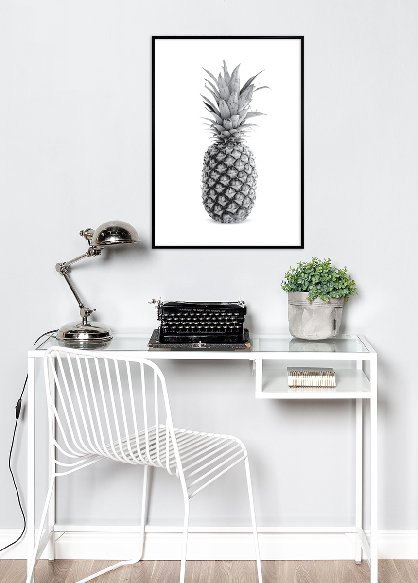 Print avec le fruit favori des passionnés de décoration, l'ananas, parfait pour ceux qui veulent être conscients du design sans avoir à acheter constamment de nouveaux fruits. Le motif en noir et blanc fait que le print s'adapte à tous les styles de décoration et pièces de la maison, le motif est également bien adapté dans un environnement public. Complétez avec un cadre de tableau uni et fin qui ne rivalise pas avec le motif et qui s'adapte à l'environnement où le tableau sera accroché.