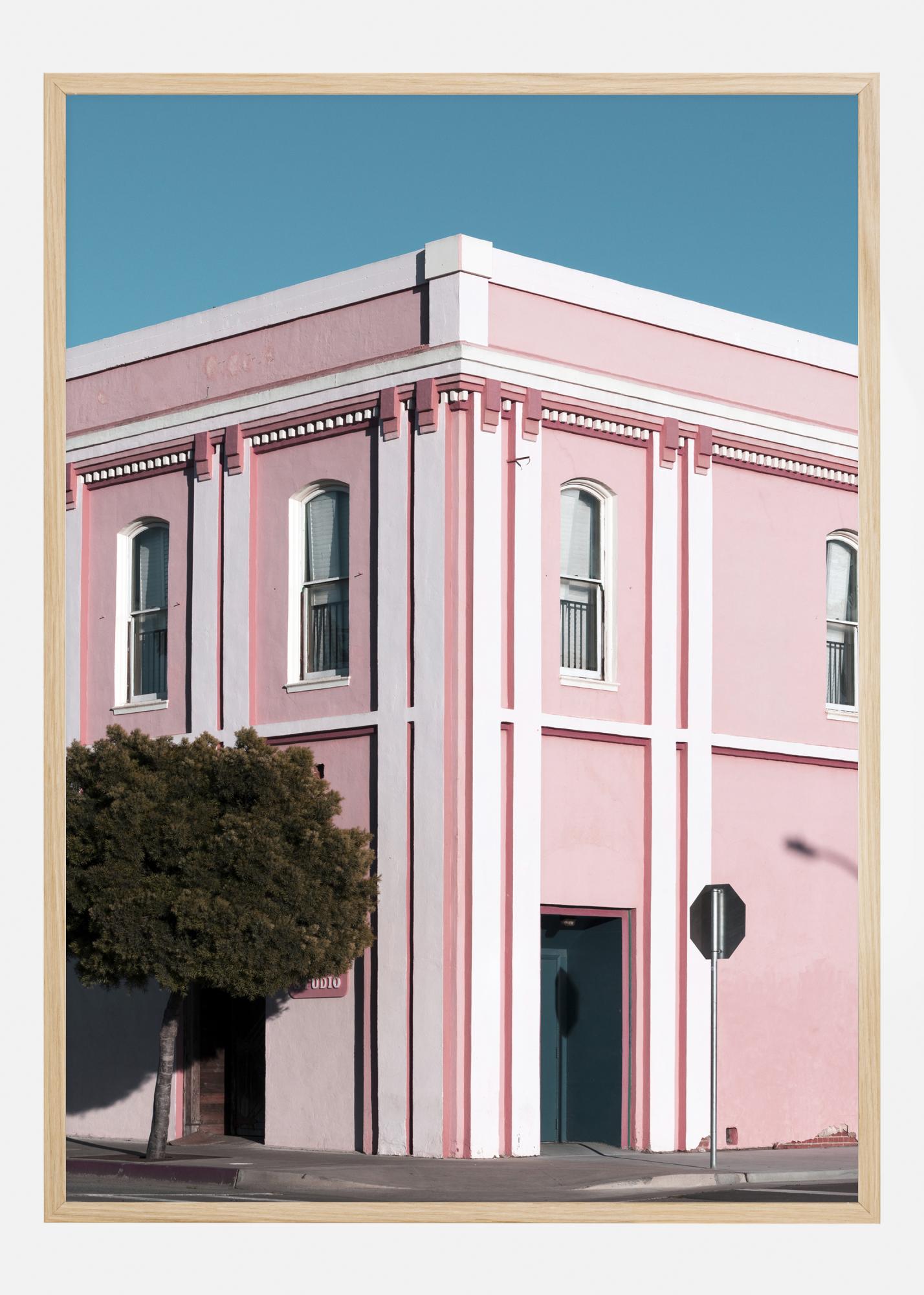 Une belle image d'un bâtiment rose à deux étages sous un ciel bleu vif. Grâce à ses couleurs fortes et vibrantes, elle suscite un sentiment de calme et d'apaisement. À gauche du bâtiment, se trouve un petit arbre touffu qui bloque presque l'entrée du bâtiment. Ajoutez une touche de couleur à votre intérieur avec cette délicieuse affiche.