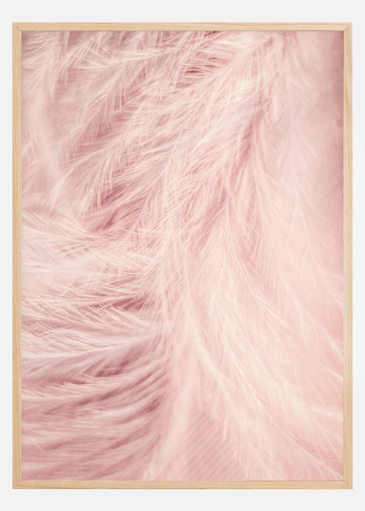 Une merveilleuse image en gros plan de plumes rose tendre. Grâce à la lumière vive qui éclaire les plumes, on ne sait pas si les plumes sont réellement roses ou blanches. Est-ce une lumière rose qui se reflète sur les plumes ? Accrochez cette affiche dans votre maison pour obtenir une sensation de chaleur douce.