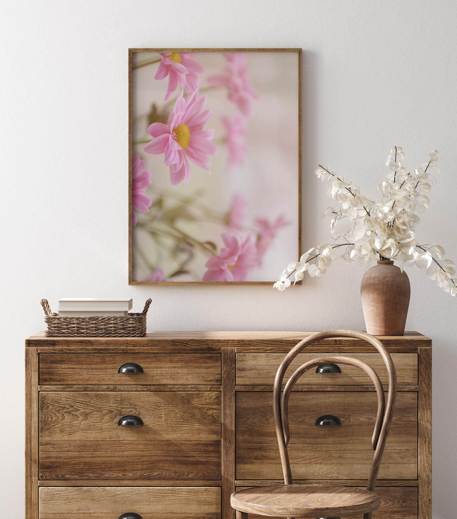Une affiche en gros plan de magnifiques marguerites roses. La beauté de ces fleurs sur fond beige crée une atmosphère heureuse et paisible. Avec une étamine jaune vif, c'est l'imprimé idéal pour créer une atmosphère paisible et affectueuse.