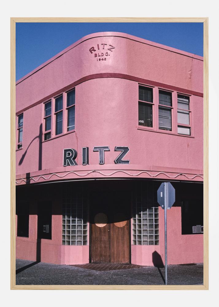 Une image lumineuse de l'immeuble rose à deux étages du Ritz. Le ciel bleu foncé met en valeur le bâtiment rose foncé et la porte d'entrée marron foncé. La lumière du soleil reflète l'ombre d'un lampadaire et d'une plaque de rue sur la façade de l'immeuble. Une affiche parfaite pour les amoureux de l'époque des années 1940.