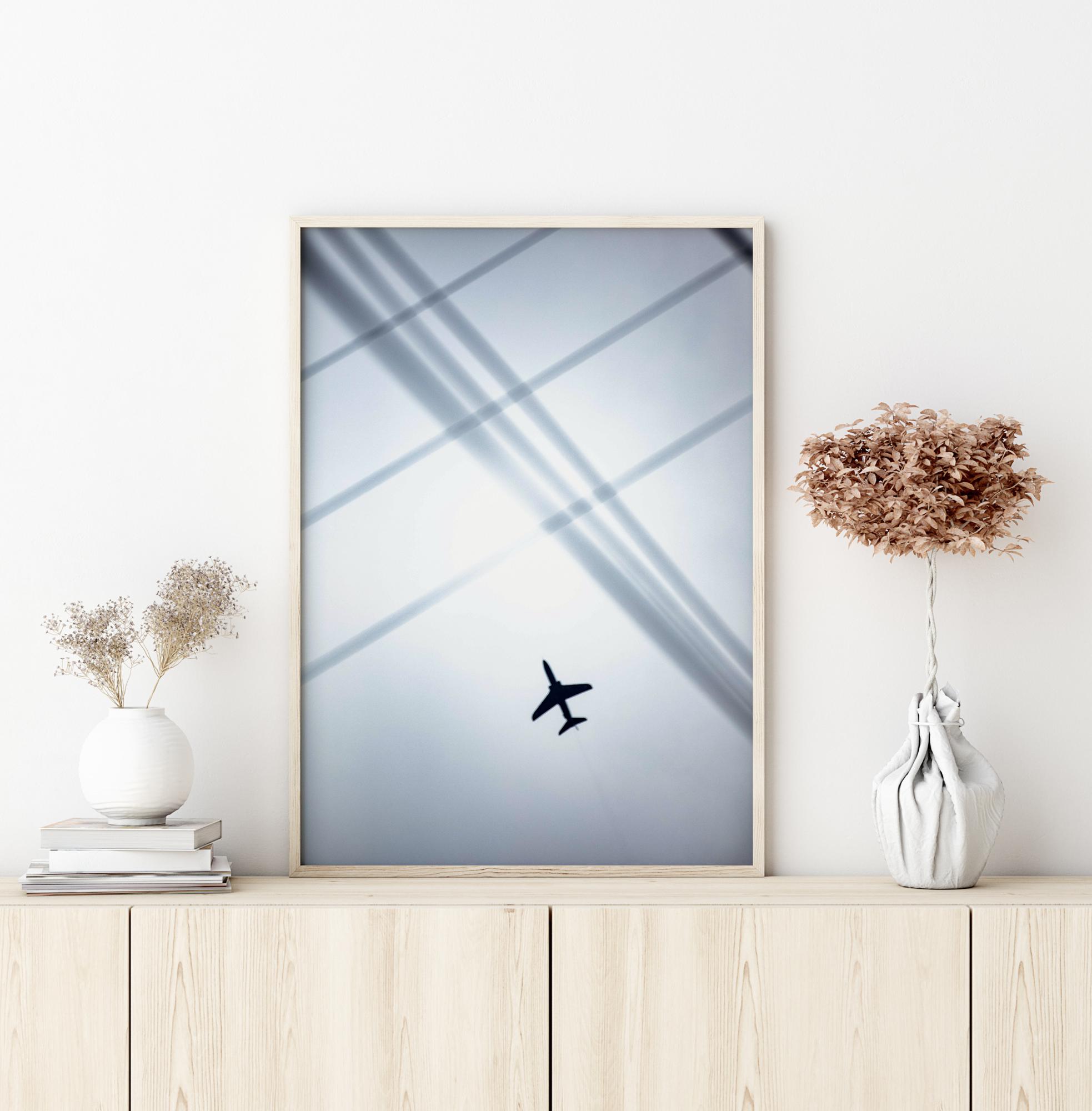 Une affiche d'un avion volant au-dessus de nos têtes. La lumière du soleil met en valeur l'avion qui se dirige vers une destination inconnue. Les lignes parallèles noires ajoutent une touche de couleur à l'image. Devinez la destination finale de cet avion lorsque vous l'accrocherez chez vous.