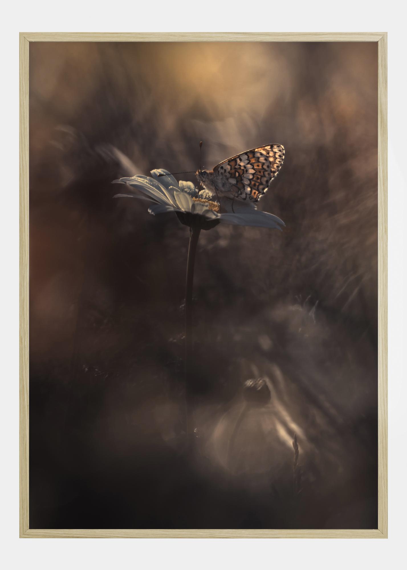 Une affiche en gros plan d'un papillon de couleur orange perché sur une marguerite à tige simple. Sur un fond de couleur pastel, les couleurs floues mettent en valeur la beauté et la délicatesse de la marguerite et du papillon. Une affiche à couper le souffle à suspendre au-dessus d'une cheminée.