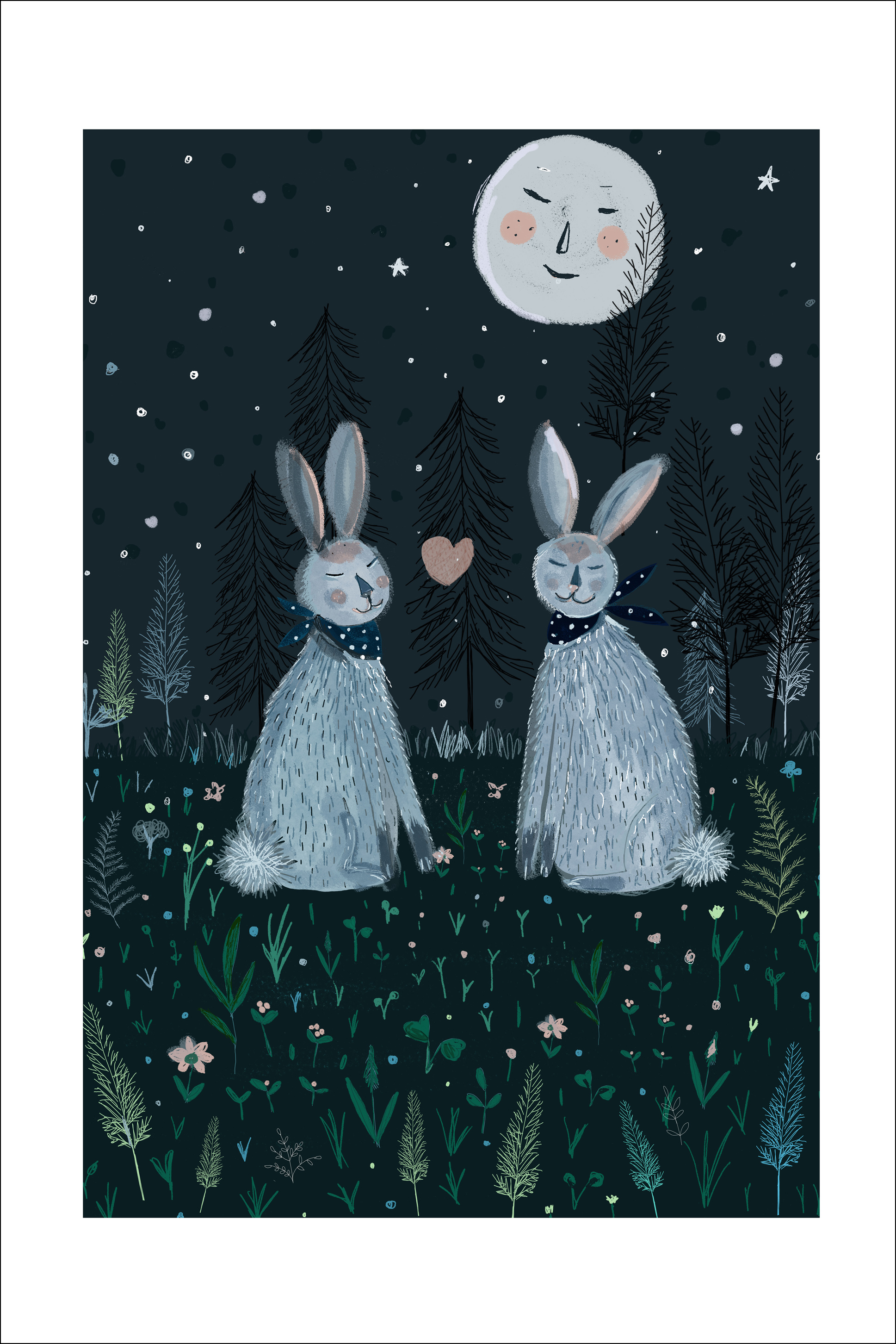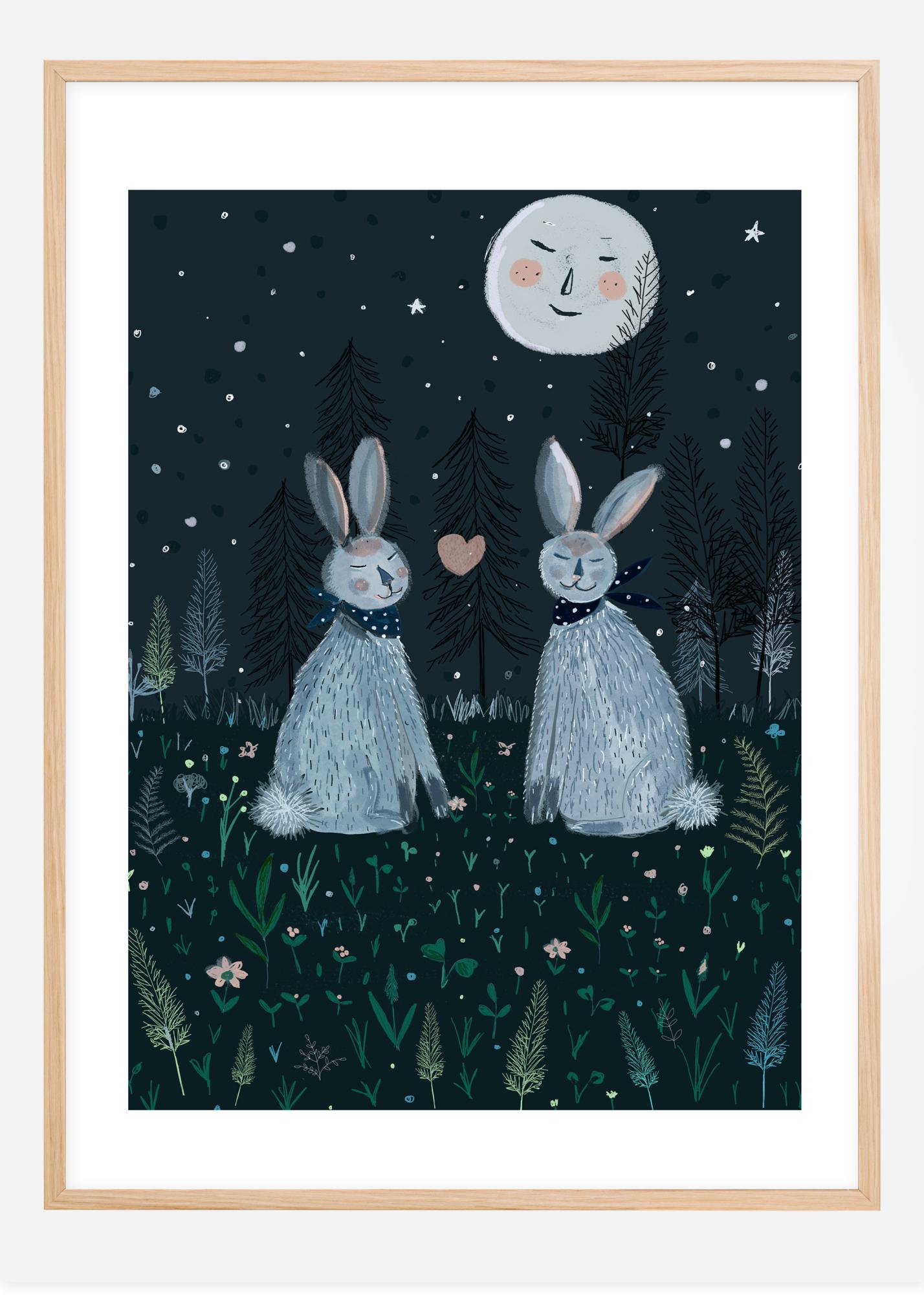 Une affiche amusante avec la lune et les lapins de la forêt qui s'endorment rapidement. Les étoiles brillent de mille feux tandis que les plantes terrestres restent fraîches dans l'atmosphère du soir. Avec des foulards noués autour du cou des lapins et un cœur placé entre eux, c'est un poster parfait pour toute personne amoureuse.