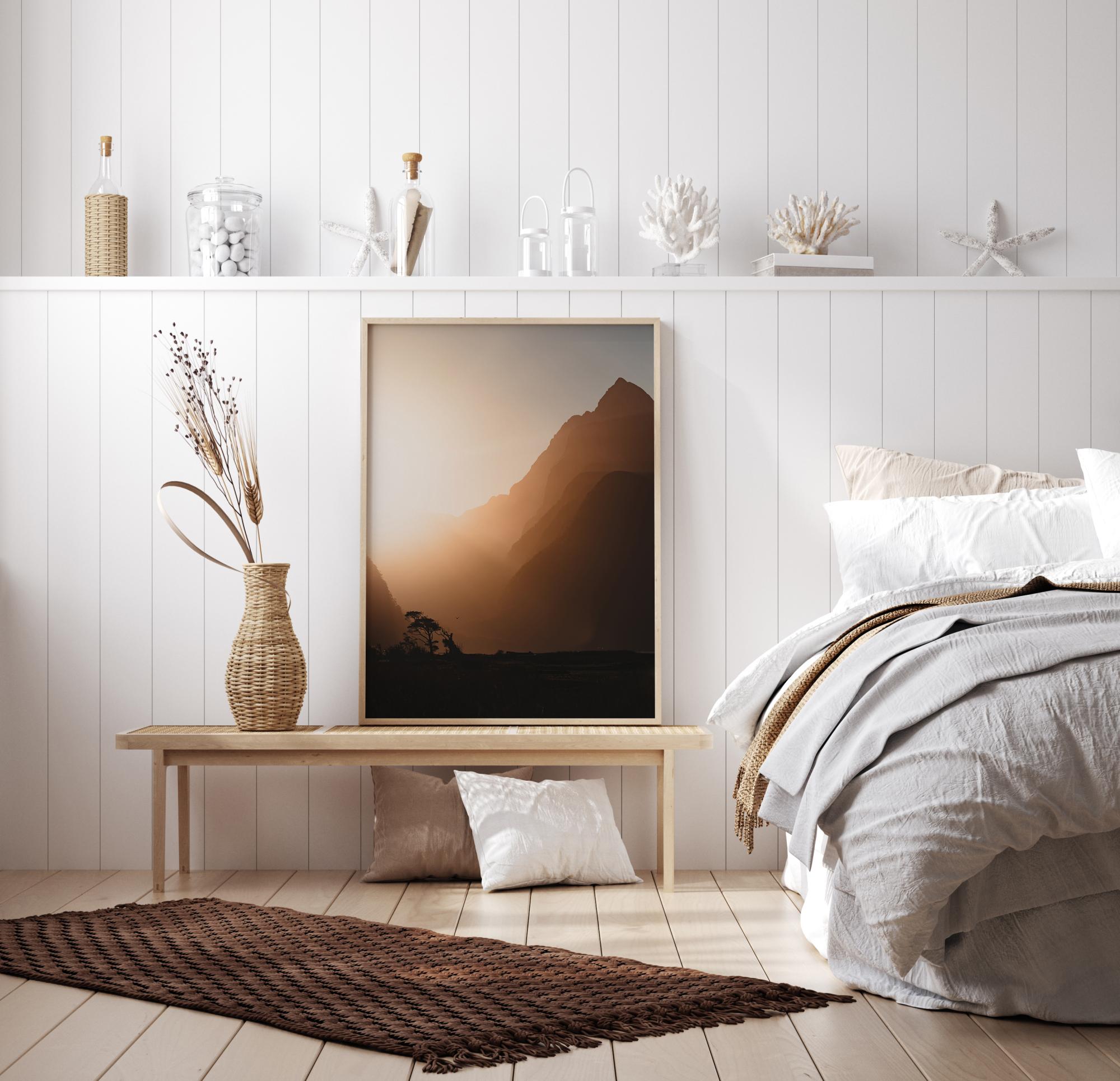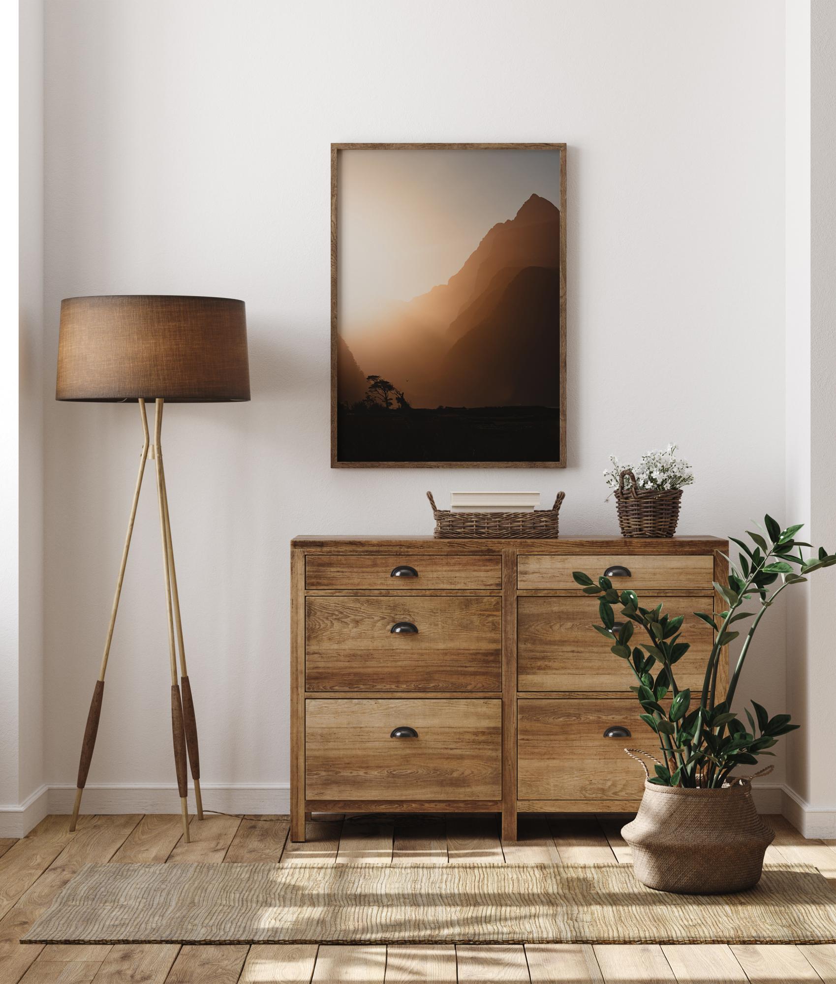 Une belle affiche panoramique d'un paysage au coucher du soleil. L'espace entre les collines brille de rayons lumineux aveuglants, créant un premier plan sombre. Les arbres lointains et l'oiseau manifestent l'existence de la vie. Décorez votre chambre à coucher avec ce poster vivant.