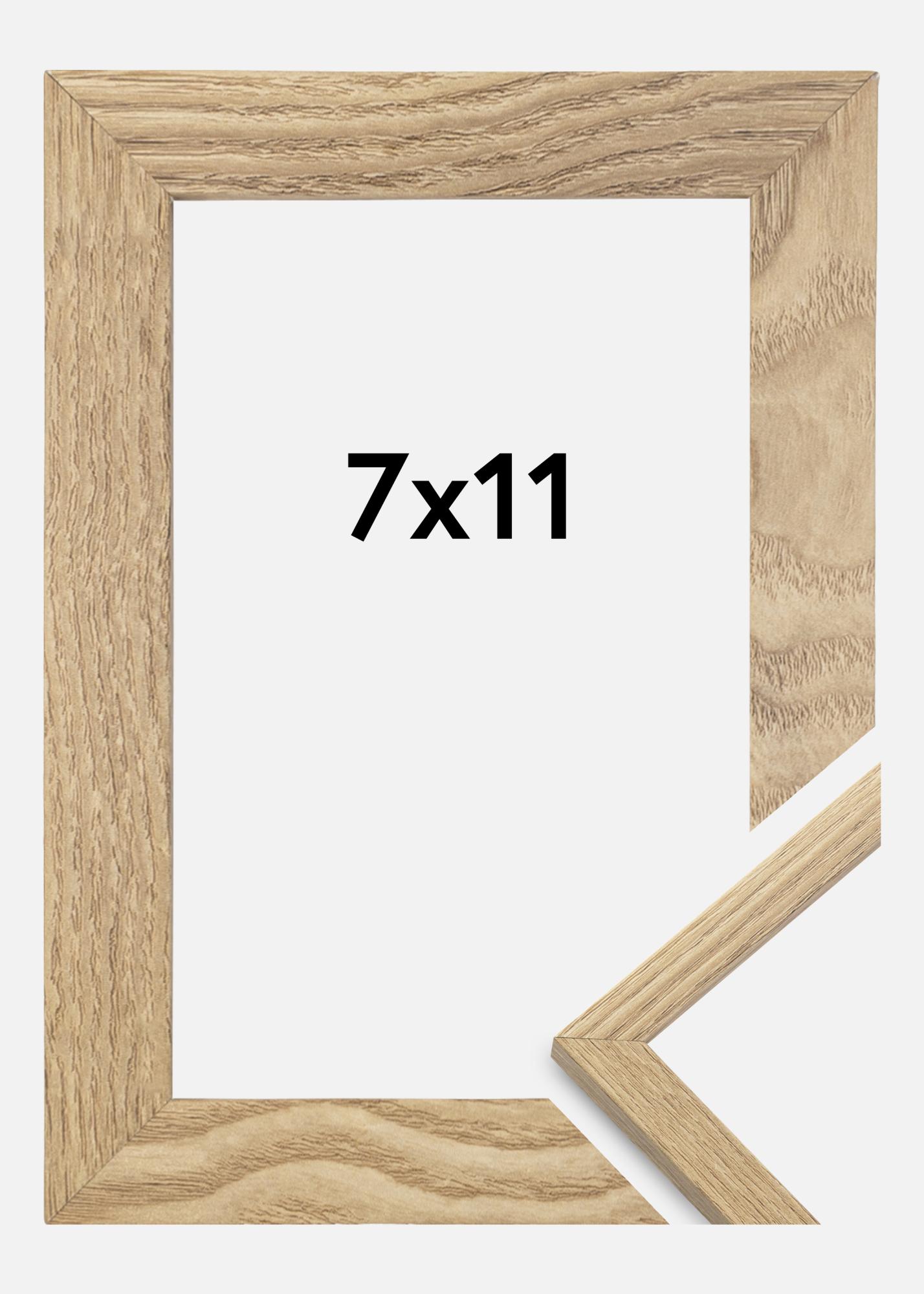 Le cadre, fabriqué en MDF avec placage en aluminium et une surface de couleur chêne est doté d'un mince profil de 14 mm. Il y a suffisamment d'espace pour combiner vos images avec un passe-partout luxueux, grâce à la profondeur intérieure du cadre (profondeur de baguette) de 12 mm.
