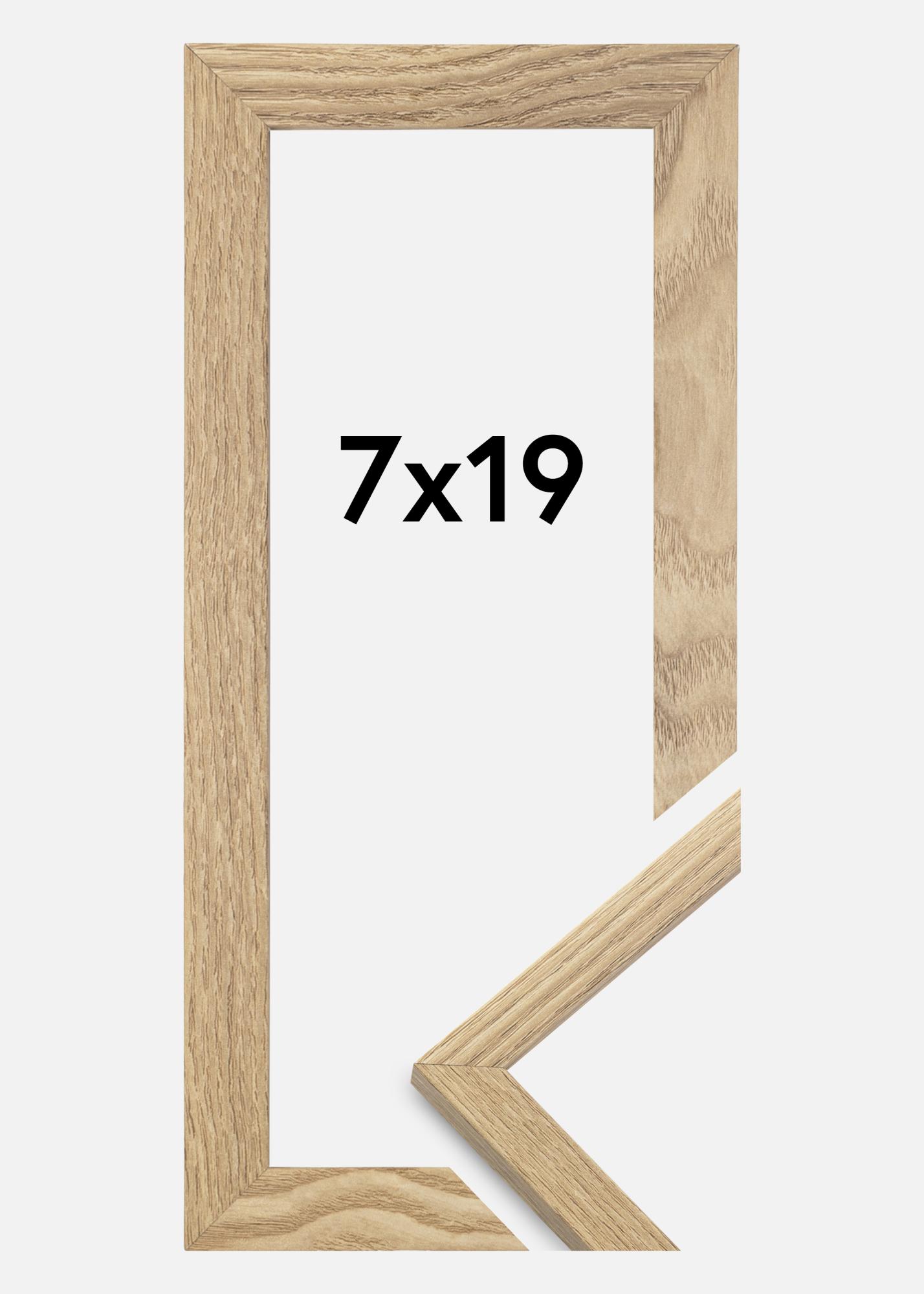 Le cadre, fabriqué en MDF avec placage en aluminium et une surface de couleur chêne est doté d'un mince profil de 14 mm. Il y a suffisamment d'espace pour combiner vos images avec un passe-partout luxueux, grâce à la profondeur intérieure du cadre (profondeur de baguette) de 12 mm.