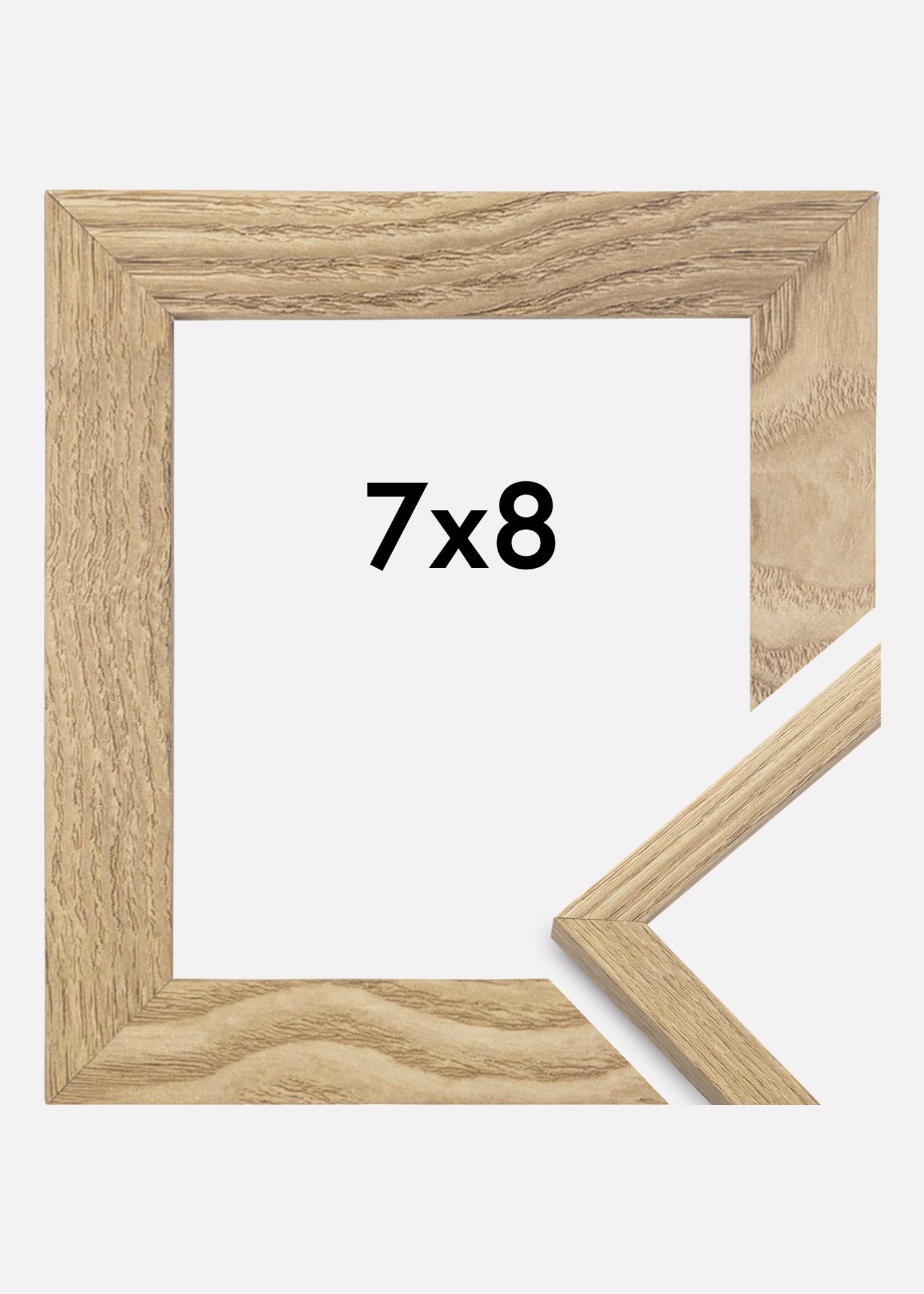 Le cadre, fabriqué en MDF avec placage en aluminium et une surface de couleur chêne est doté d'un mince profil de 14 mm. Il y a suffisamment d'espace pour combiner vos images avec un passe-partout luxueux, grâce à la profondeur intérieure du cadre (profondeur de baguette) de 12 mm.