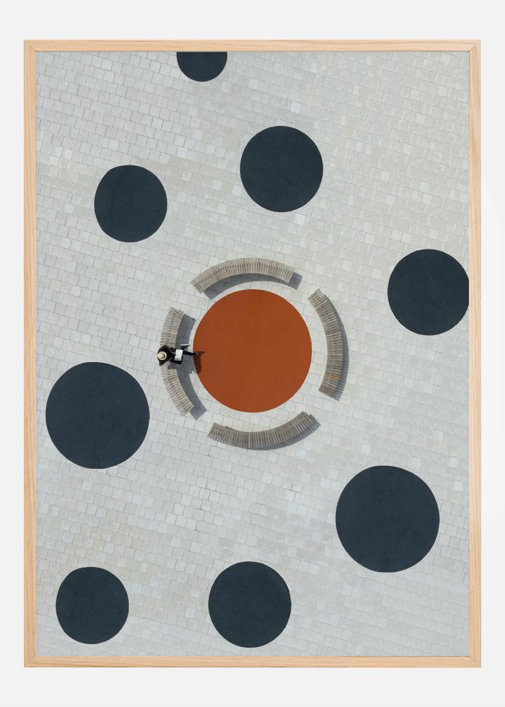 Ce poster conceptuel capture une image distincte en vue aérienne d'une personne en train de lire, entourée d'une composition symétrique et graphique. Le design abstrait de la surface carrelée blanche, ponctué de grands cercles noirs et d'un cercle central rouge rouille avec des bancs, offre un contraste visuel fort. Ce poster est non seulement un hommage au design et à l'architecture, mais aussi une interprétation ludique de scènes quotidiennes.