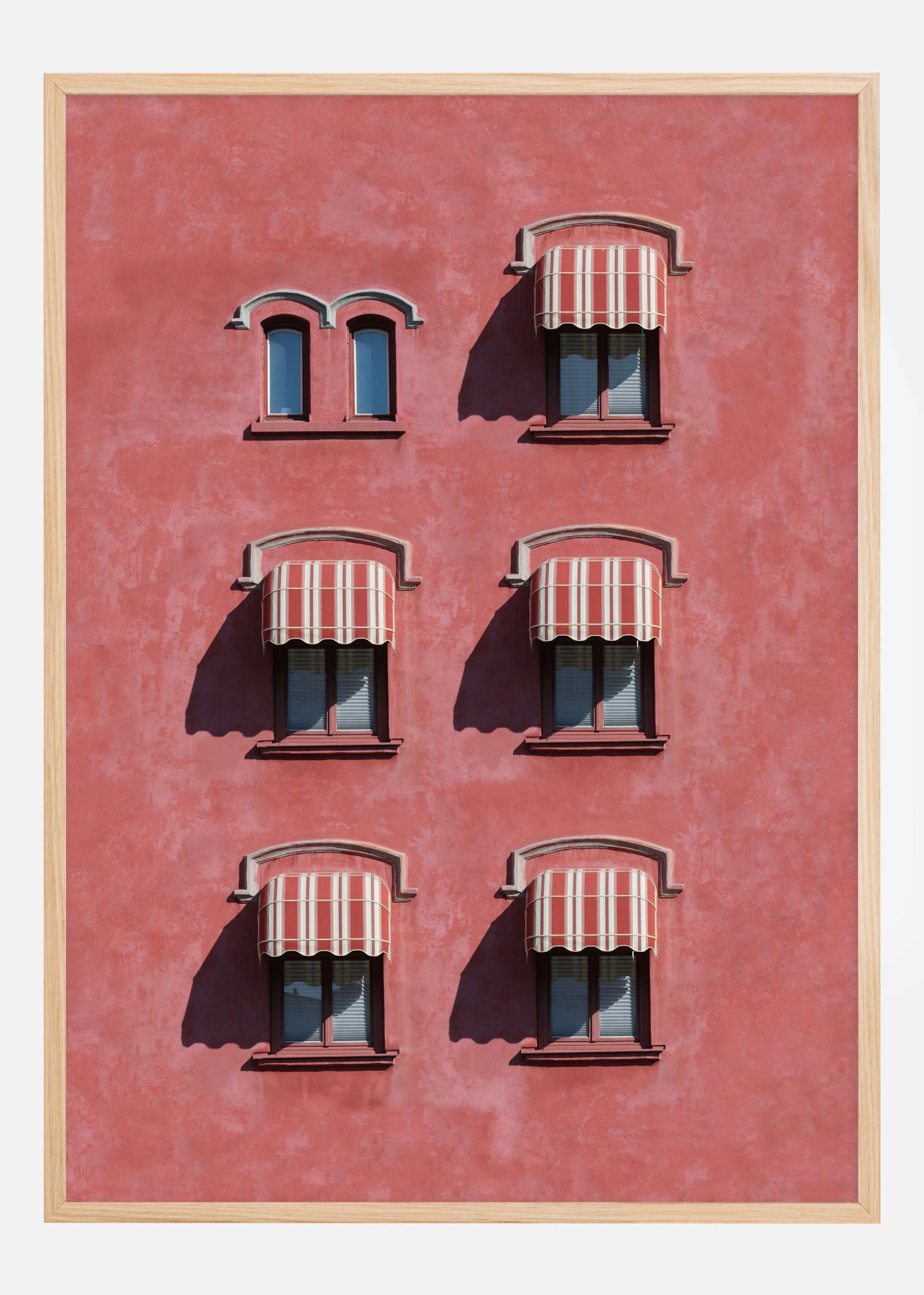 Cette affiche élégante et sophistiquée, "Mur Rouge", est une démonstration d'harmonie architecturale et de balance visuelle. Six fenêtres, chacune avec un store distinct, ornent la façade rouge vive et offrent une symétrie rythmique qui est à la fois apaisante et satisfaisante pour l'œil. Le jeu enjoué du soleil sur la surface donne vie à la structure et crée un jeu entre lumière et ombre.
