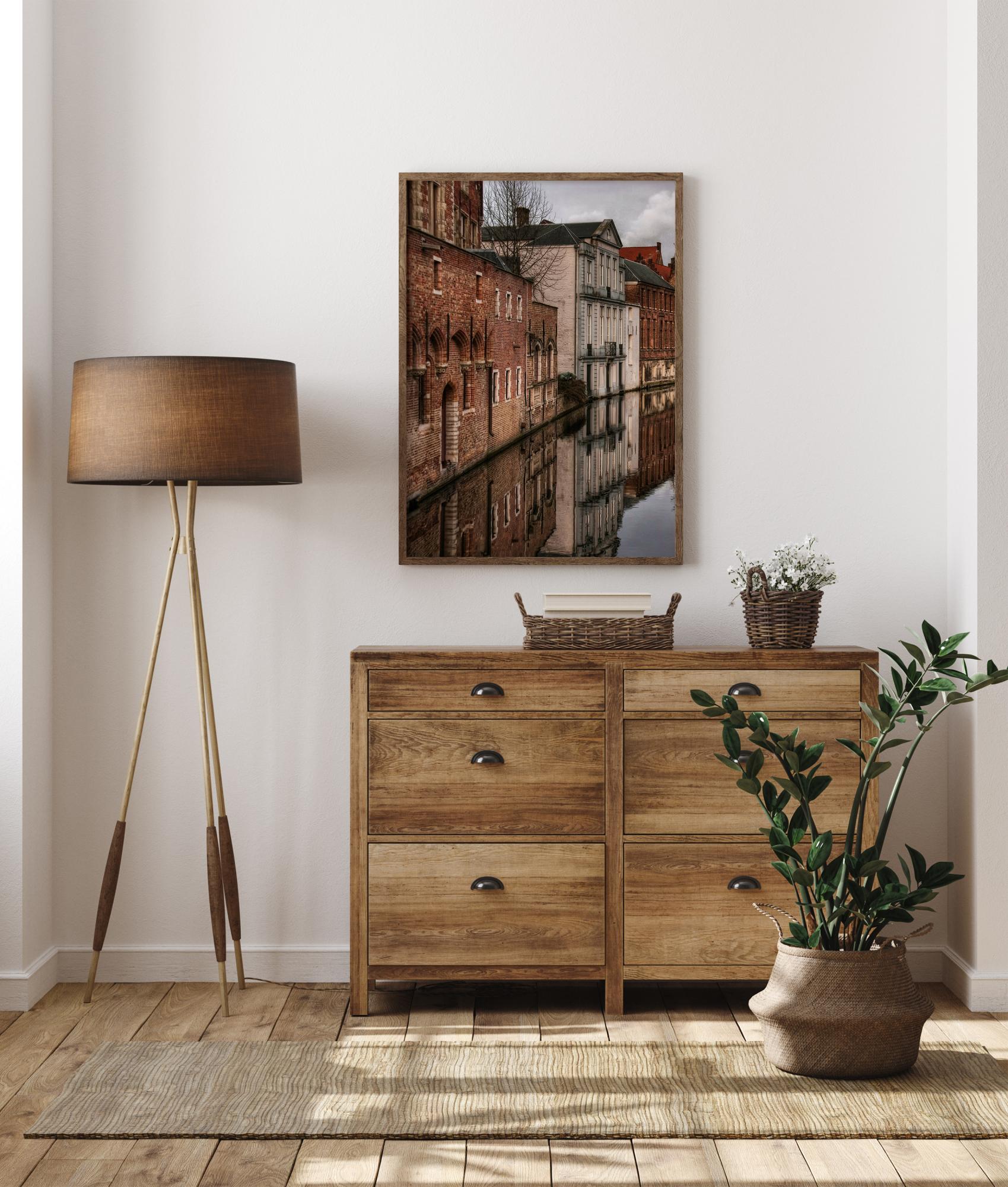 Une affiche nostalgique de lignes de vieilles maisons le long d'une rivière. Les simples maisons rustiques en briques rouges et leurs détails architecturaux se reflètent dans les eaux calmes en contrebas. Imaginez que vous flottez le long de ces bâtiments tout en réfléchissant au passé.