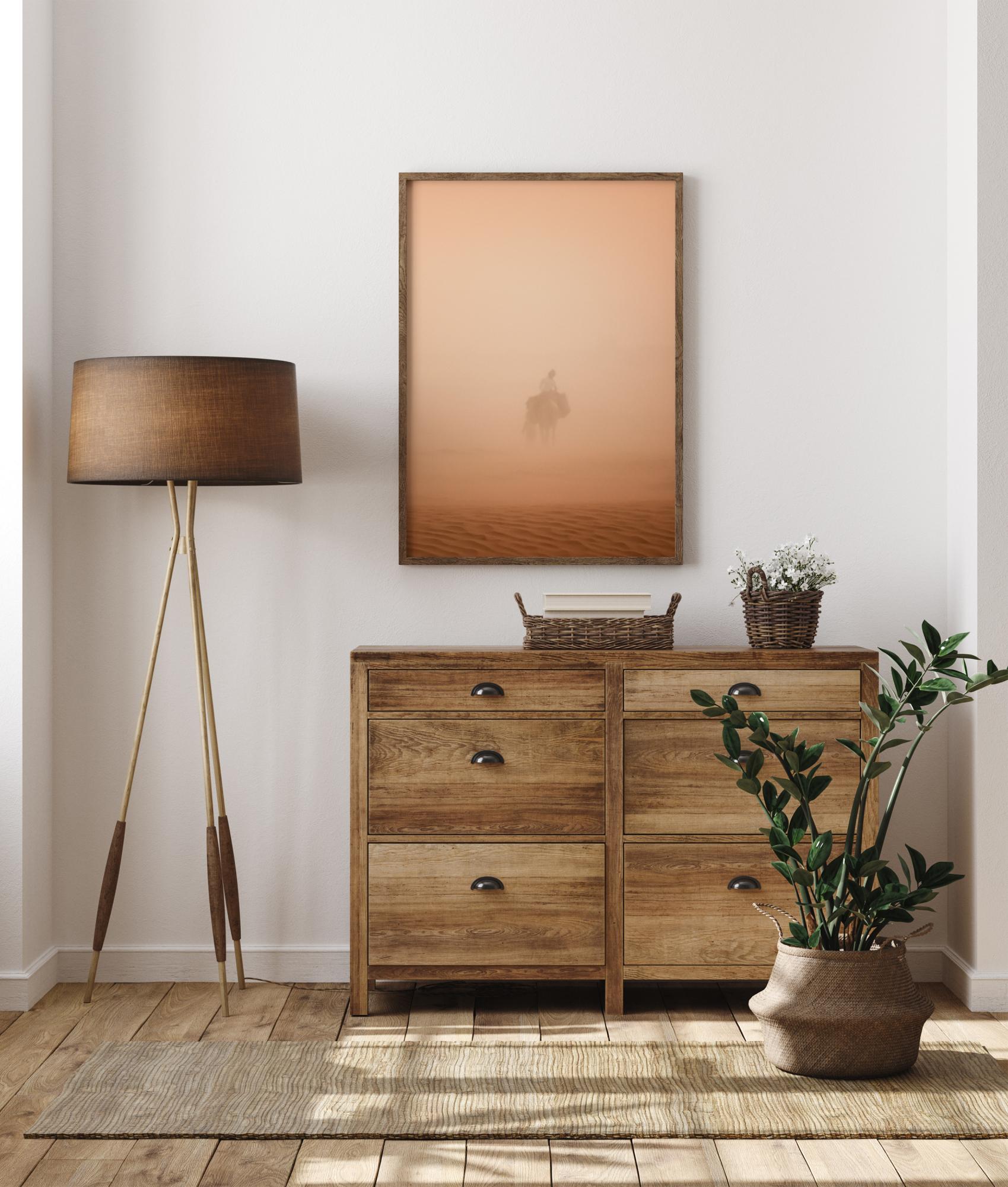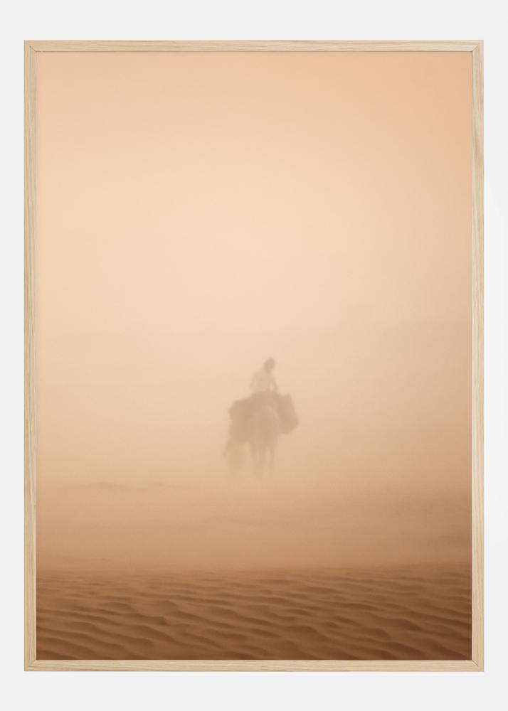 Une affiche d'une tempête de sable. On peut voir le sable du désert au premier plan avant qu'il ne se transforme en une brume tourbillonnante de couleurs douces. Au centre, on aperçoit la forme ténue d'une silhouette, à cheval, qui se débat dans la tempête. Ressentez la chaleur du désert.