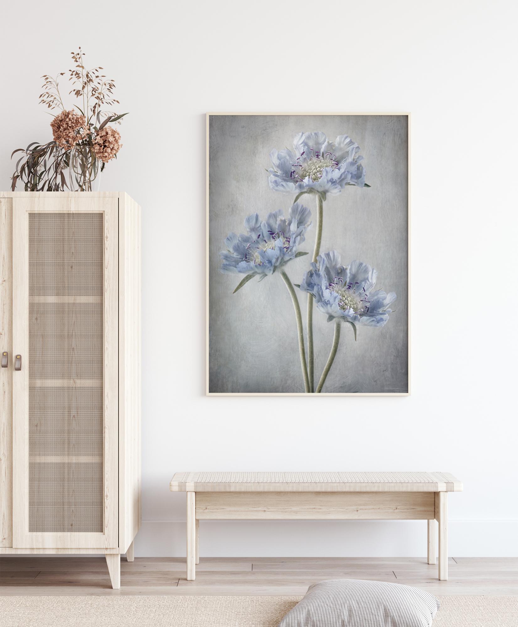 Une affiche éthérée de trois Scabiosa en fleurs sur un mur bleu pâle. Les délicieux pétales bleus s'enroulent vers le haut dans cette peinture étonnante. Les fleurs sont illuminées par le fond blanc plus pâle pour les faire ressortir. Réveillez-vous avec cette nature morte paisible dans votre chambre.