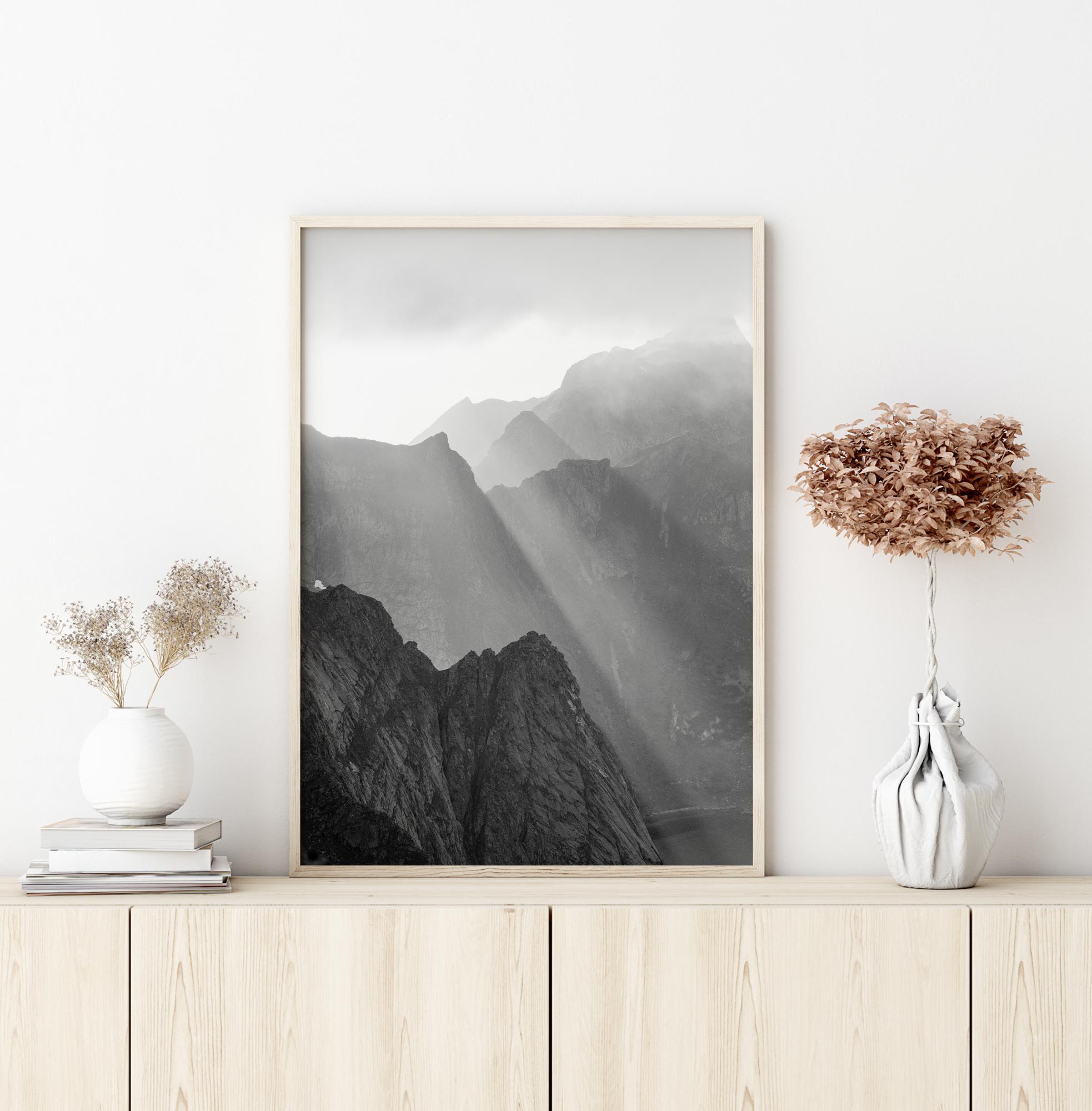 Une affiche de paysage majestueux où un faisceau de lumière solaire intense brille à travers les montagnes. Les formes sombres et escarpées du flanc de la montagne s'élèvent dans le blanc éclatant du ciel où le soleil brille. Ajoutez cette superbe photo à votre mur pour obtenir une scène à la fois spectaculaire et magique.