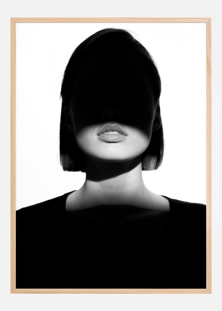 Ce poster saisissant capture une image puissante d'une femme dont les yeux sont cachés par une ombre sombre, créant un effet mystérieux et poignant. Le contraste vif entre les reflets blancs et les tons noirs profonds accentue ses lèvres marquées et ses traits de visage sculpturaux. C'est une image qui équilibre sur la frontière entre visibilité et anonymat, lumière et obscurité, et qui incite le spectateur à rechercher des significations plus profondes.
