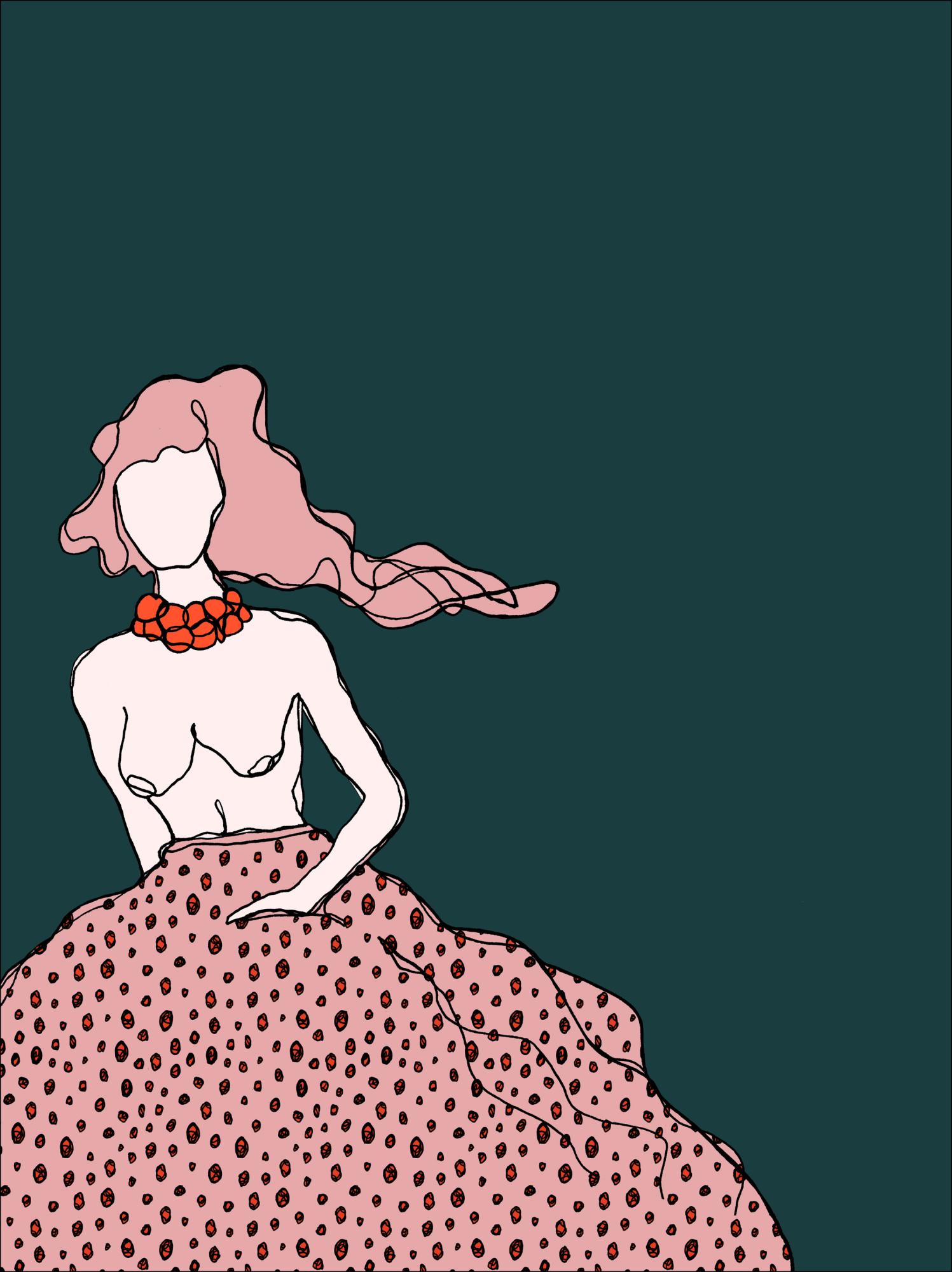 Une affiche amusante d'une fille sur un fond vert bouteille. La femme est torse nu, avec une grande jupe rose à pois qui se déploie. Ses cheveux roses sont balayés par un vent invisible. Des perles orange vif ornent son cou et elle cache une main dans sa poche. Le croquis a du mouvement et offre une ambiance décontractée, parfaite pour une décoration murale qui se suffit à elle-même.
