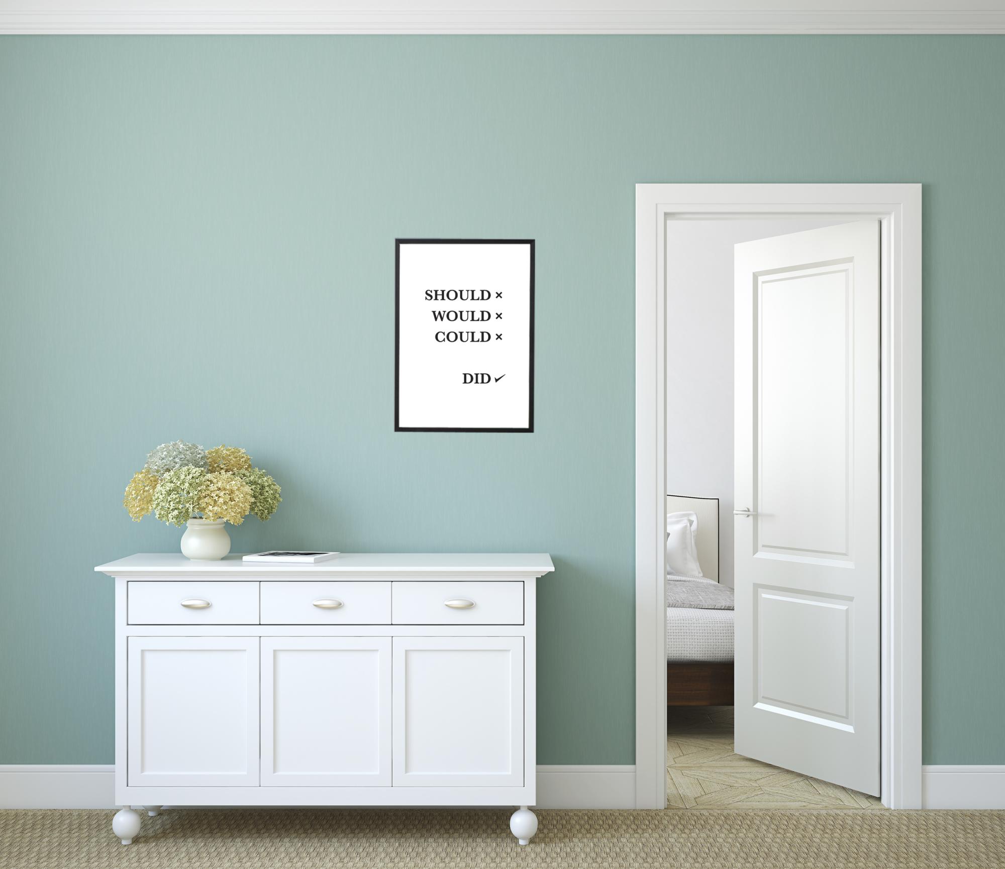 Pourquoi compliquer toutes les idées brillantes que vous avez avec des pensées limitantes ? Il suffit de le faire ! Avec ce poster sur le mur, il n'y a plus d'excuses. Le poster est blanc avec une impression noire composée d'une liste avec le texte "Should Would Could", où chaque mot est suivi d'une croix. Tout en bas, le mot "Did" est suivi d'une coche. Le design noir et blanc se marie très bien avec un cadre coloré. Comme le poster est disponible en plusieurs tailles, vous en trouverez un aussi bien pour le bureau que pour le mur.