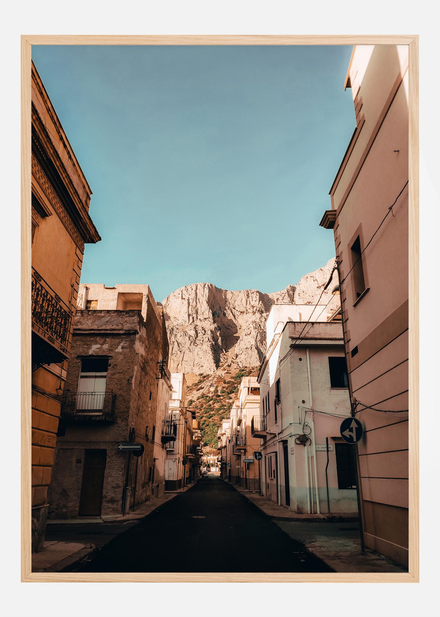 Ce poster enchanteur capture l'essence d'une rue pittoresque dans le village sicilien de Cinisi, avec ses chaudes teintes terreuses et un arrière-plan de la montagne impressionnante s'élevant contre un ciel bleu clair. Les tons rose pâle et jaune des bâtiments contrastent magnifiquement avec le terrain montagneux brut à l'arrière-plan, offrant une sensation de calme et de tranquillité. Cette impression est un hommage au charme rustique de la Sicile et à sa capacité à unir nature et culture en une harmonie parfaite.