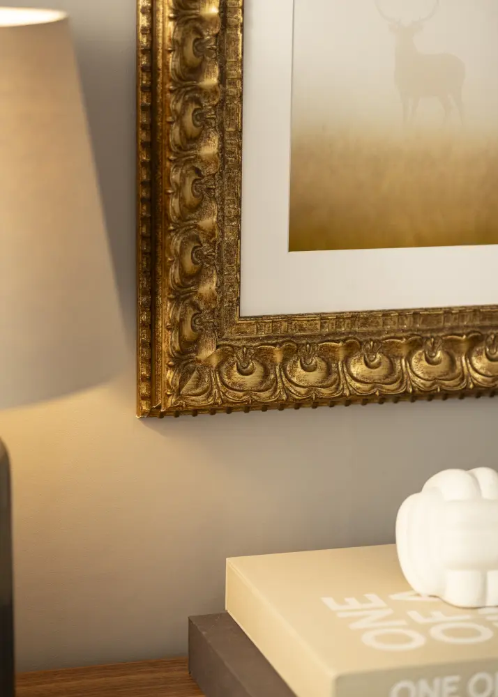 Transformez vos photos en œuvres d'art avec notre cadre exclusif Skokloster Or. Ce cadre photo est conçu pour donner à vos souvenirs un encadrement élégant avec sa finition dorée classique et son profil richement orné. L'apparence antique est renforcée par une surface patinée, ce qui donne au cadre une sensation intemporelle et sophistiquée qui convient parfaitement dans les environnements modernes et traditionnels.