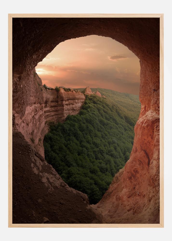 Une affiche impressionnante d'un paysage rouge spectaculaire. Regardez par l'ouverture dans la falaise pour voir les roches rouges qui s'étendent au loin. Les arbres verts qui poussent forment un contraste parfait, tandis que le soleil couchant jette une lueur chaleureuse sur le tableau. Visitez cette vue depuis le confort de votre maison.