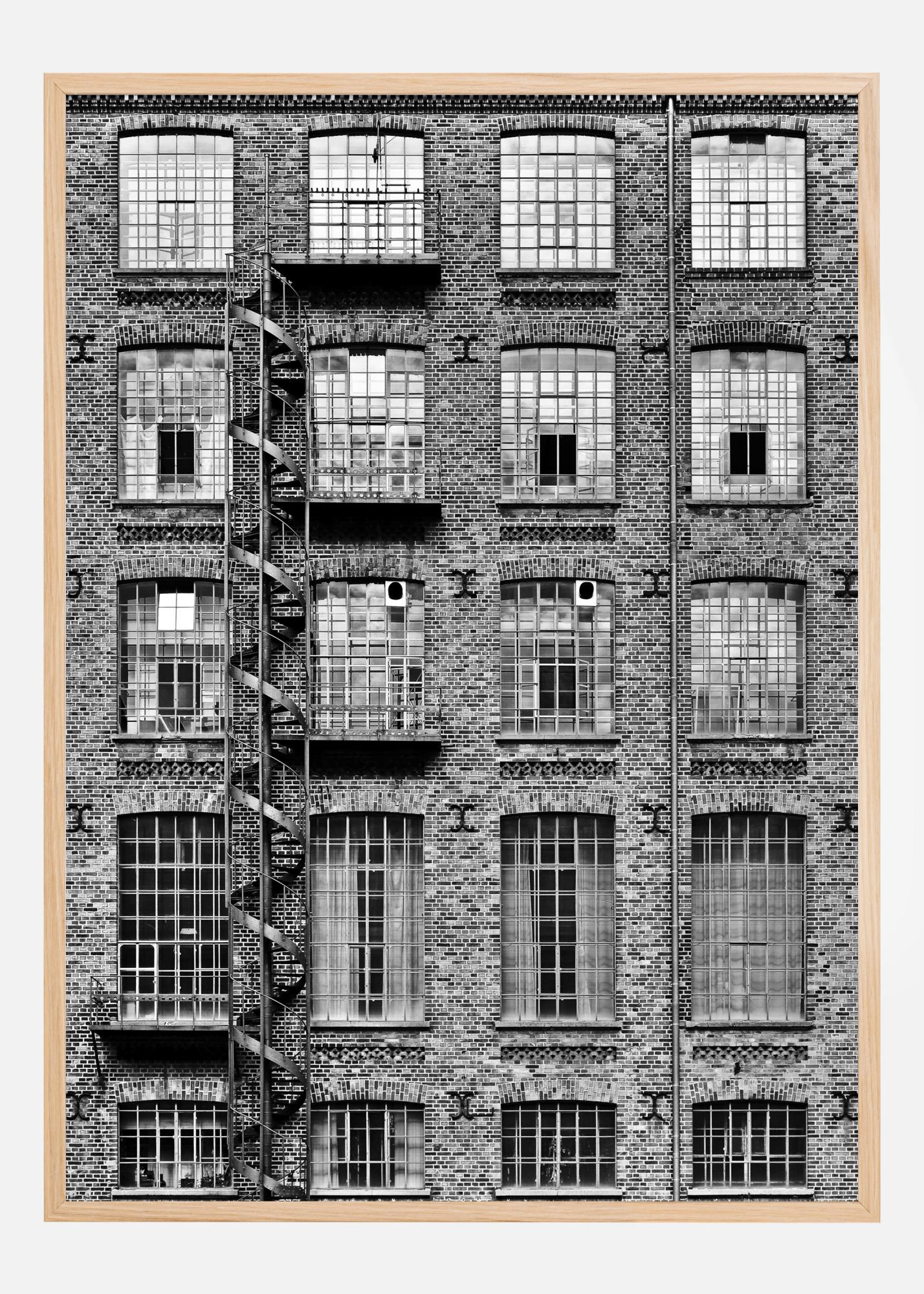 Une affiche urbaine représentant la façade d'un vieil immeuble avec un escalier en colimaçon. Les fenêtres carrées spectaculaires contrastent avec les courbes de l'escalier. Cette affiche est idéale pour les formes géométriques.