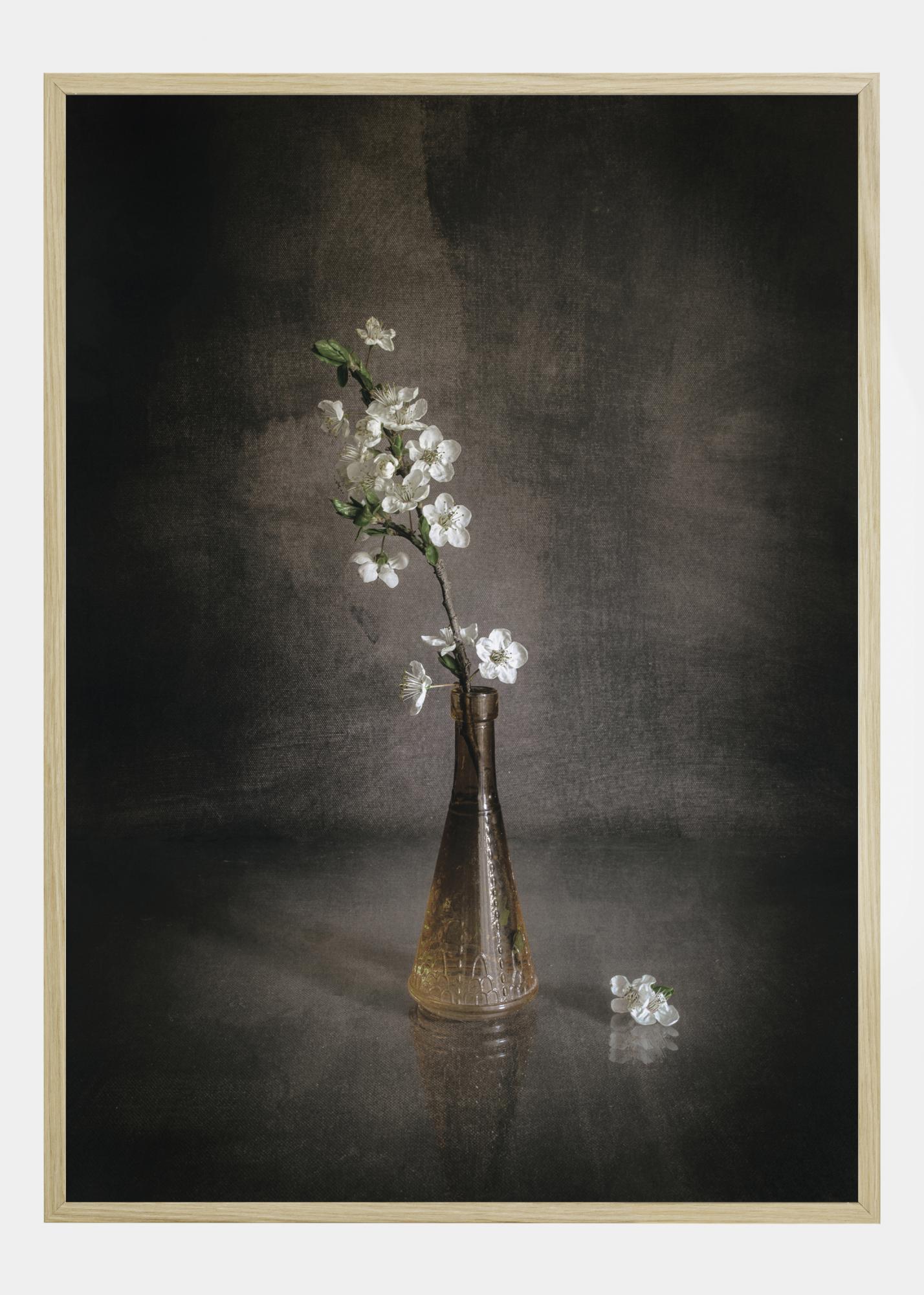 Une affiche printanière de fleurs blanches dans un vase brun fin. Le vase projette des ombres dans deux directions, créant un point focal lumineux. Les fleurs en forme d'étoile s’y détachent sur les larges coups de pinceau brun foncé du mur derrière. Contemplez cette élégante nature morte printanière.