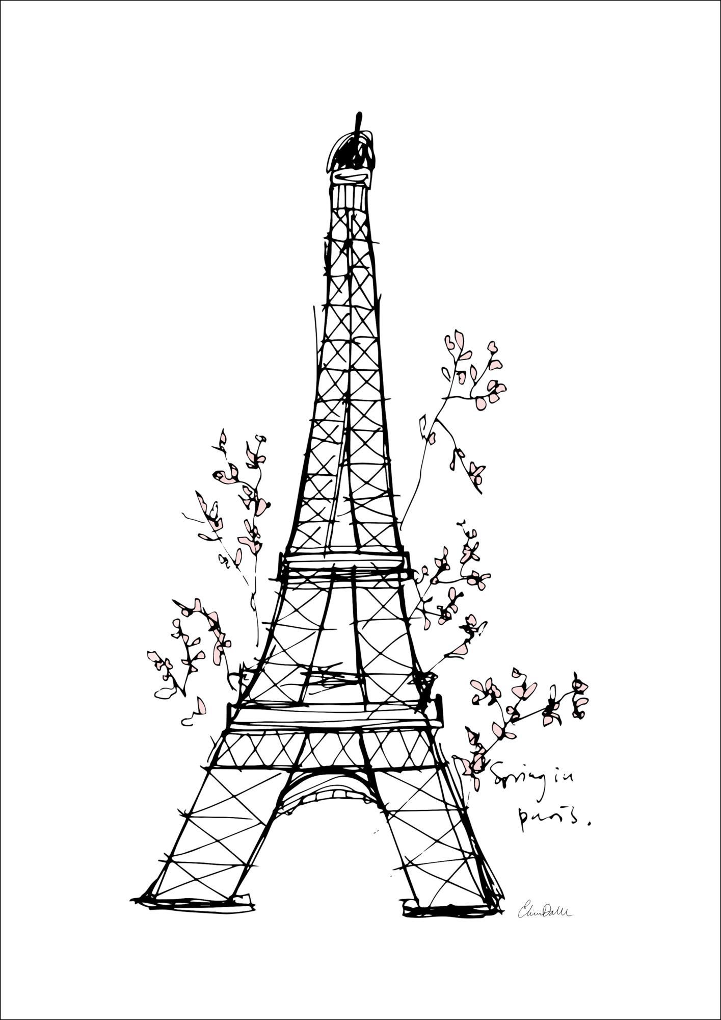 Une affiche historique présentant un simple dessin à l'encre de la Tour Eiffel. Les lignes rugueuses de cette image et l'inclinaison décentrée de la tour lui confèrent un caractère illustratif. De grandes branches fleuries s'étendent derrière la tour pour donner un air de printemps à Paris.