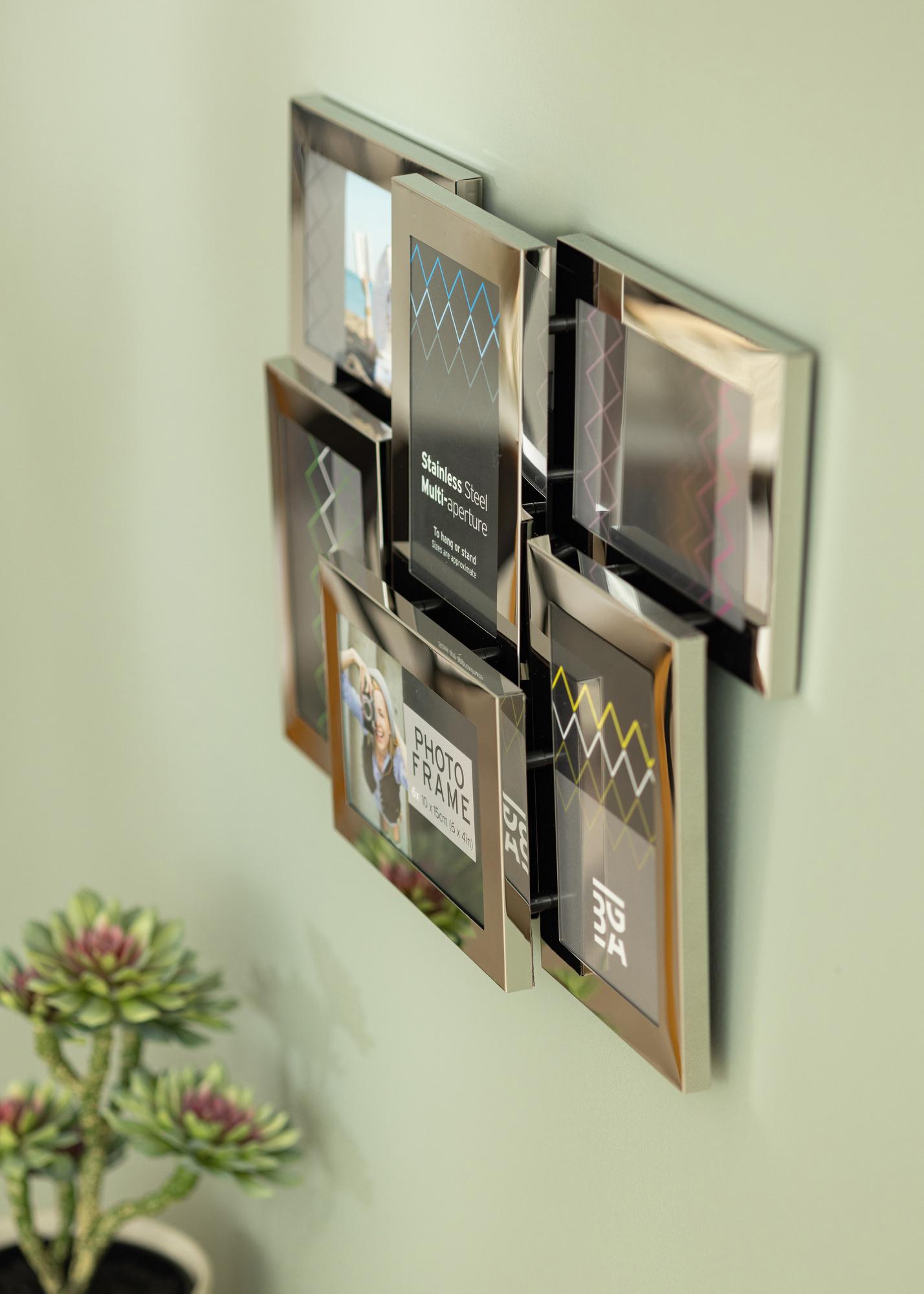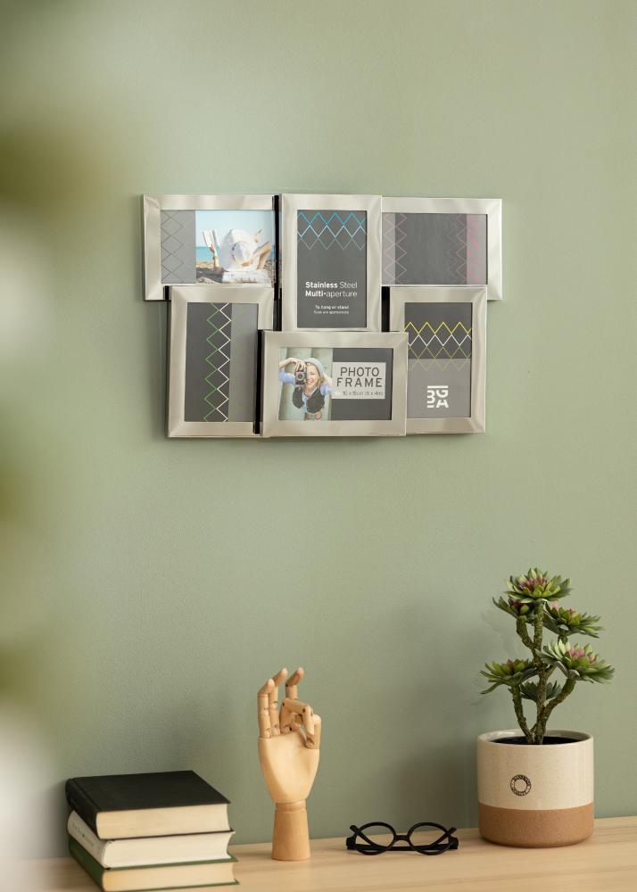 Voici un cadre multivue pour 6 photographies de format 10x15 cm. Le cadre a une apparence moderne, grâce à son matériau robuste en métal et sa teinte argentée brillante. Vous pouvez choisir d'accrocher le cadre au mur ou de le poser par exemple sur l'étagère ou le rebord de fenêtre.