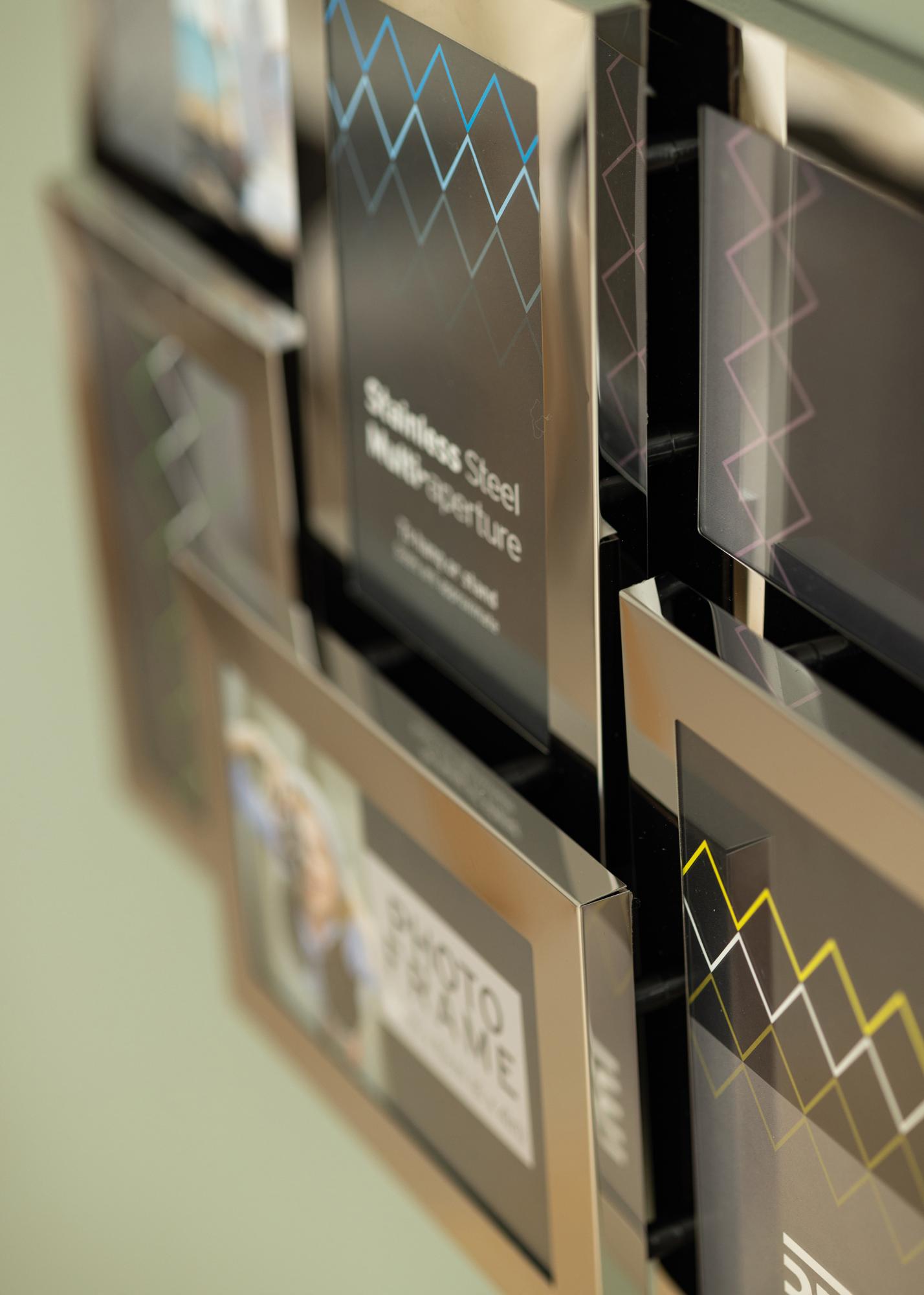 Le cadre peut contenir trois photographies dans un format portrait et trois photographies dans un format paysage. Pour insérer les images dans le cadre il suffit de tourner les petites broches métalliques situées à l'arrière du cadre, de retirer le carton de fond et d'insérer votre image derrière le verre. Chaque image a son propre petit carton de fond pour que vous puissiez facilement placer ou changer une image à la fois.