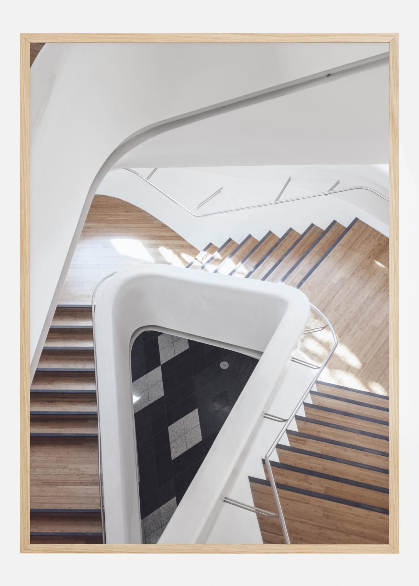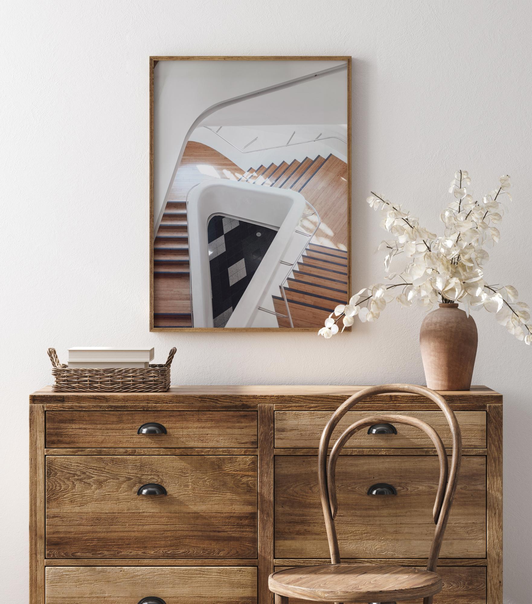 Une affiche d'intérieur représentant un ensemble d'escaliers disposés en triangle. Les marches sont brunes, les murs et les rampes sont blancs avec des rails chromés. Elles se courbent vers le bas et s'arrondissent jusqu'à un sol carrelé noir et blanc. Regardez d'en haut cette image à la Escher et imaginez que vous traversez ces jolies marches.
