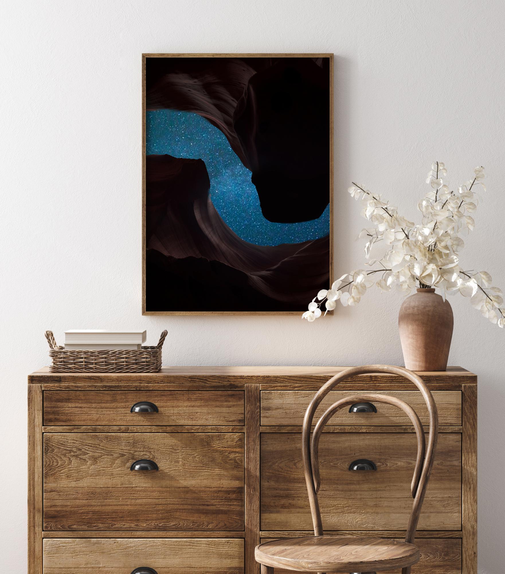Une magnifique affiche nocturne du ciel étoilé qui se détache des formations rocheuses spectaculaires. Les roches d'un rouge profond tourbillonnent en haut et en bas de cette photo. Un chemin étoilé qui permet au ciel nocturne de briller apparaît . Cette affiche vivante est conçue pour susciter l'admiration.