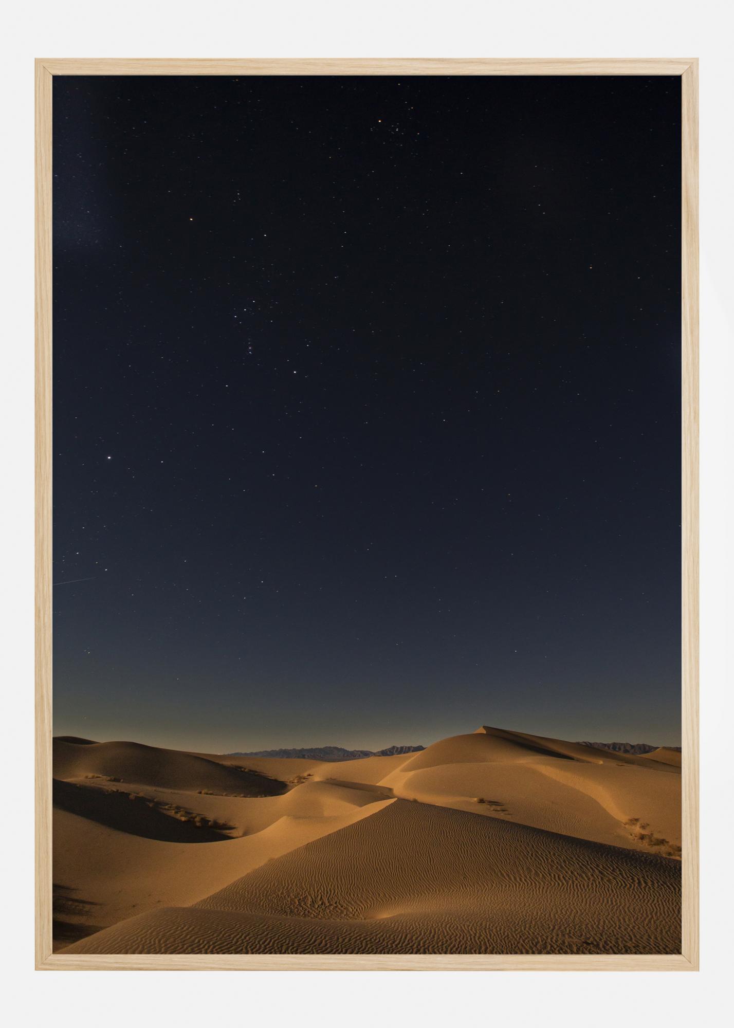Un poster évocateur du désert la nuit. De douces dunes jaune doré s'étendent au loin au bas de cette image. Au-dessus du sable s'étend une énorme étendue de ciel bleu foncé parsemé d'étoiles. Créez une sensation de vaste espace en ramenant cette image à la maison.