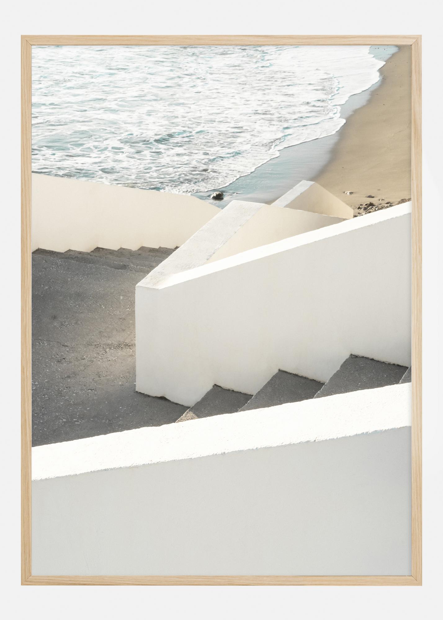 Ce poster procure une sensation à la fois d'architecture et de nature en montrant une structure en escaliers blancs qui mène à une plage paisible et à la mer calme. Le jeu entre la lumière et l'ombre sur les marches, combiné au contraste entre l'architecture stricte et le littoral doux, crée une image à la fois apaisante et visuellement intéressante.