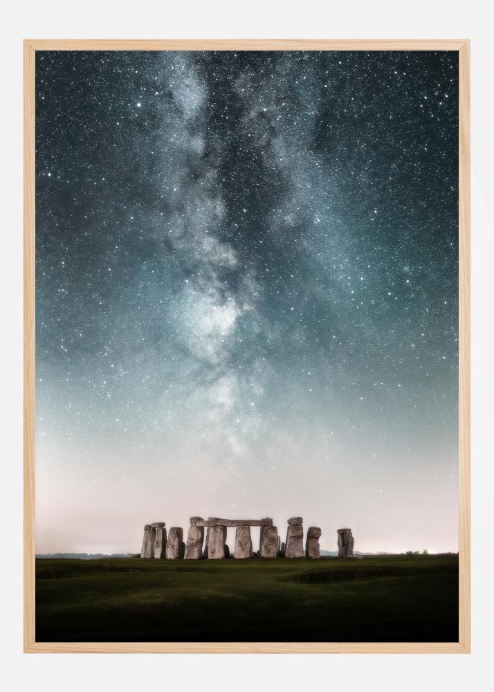Un célèbre poster de Stonehenge sur fond de ciel nocturne étoilé. Ce plan large met l'accent sur l'impressionnante Voie lactée qui se faufile dans un ciel bleu riche en étoiles. Suivez la galaxie vers le bas jusqu'à ce que vous voyiez Stonehenge comme une minuscule formation rocheuse au bas de l’affiche. Une vision différente de cette impressionnante merveille du monde.