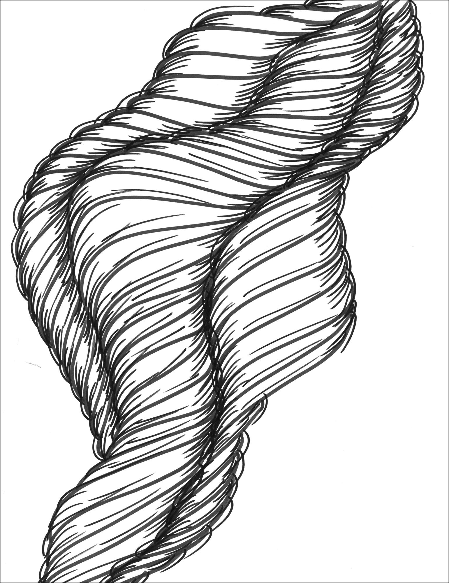 Une affiche abstraite tourbillonnante de lignes noires qui s'entrelacent pour créer une tornade. Trois spirales de lignes noires s’emmèlent sur un fond blanc. Les lignes épaisses et fines créent une image presque en mouvement qui transporte le regard à mesure qu'il dérive sur cette œuvre.