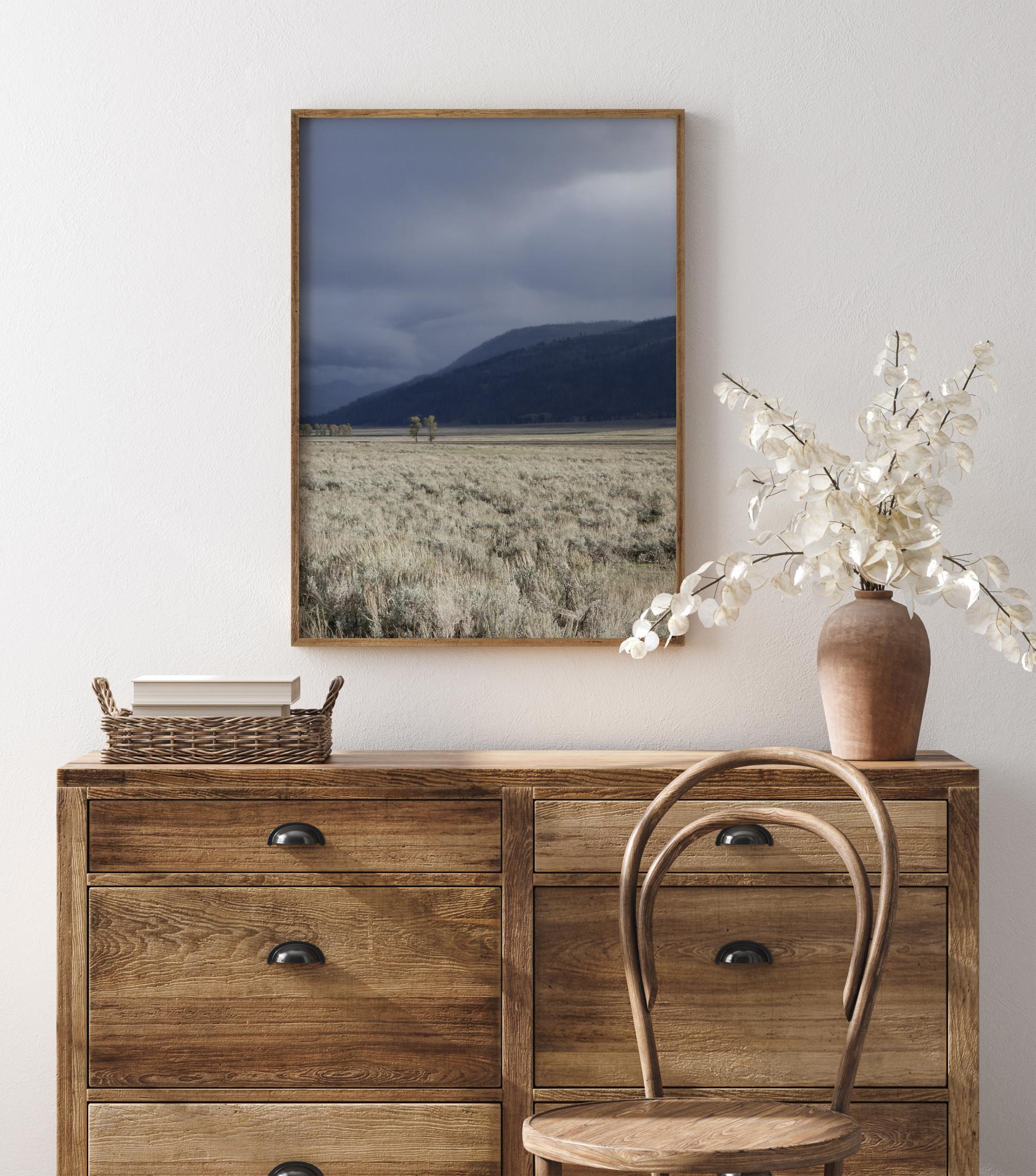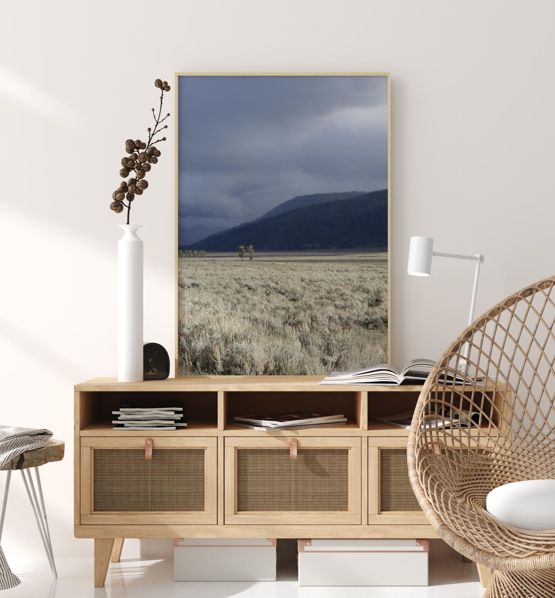 Une affiche inquiétante d'une tempête imminente sur un champ d'herbe blanche. Des nuages sombres s'amoncellent au loin au-dessus de montagnes bleues. Le champ blanc brille contre les nuages sombres qui arrivent bientôt. La pression monte au fur et à mesure que ces nuages arrivent dans cette scène dramatique.