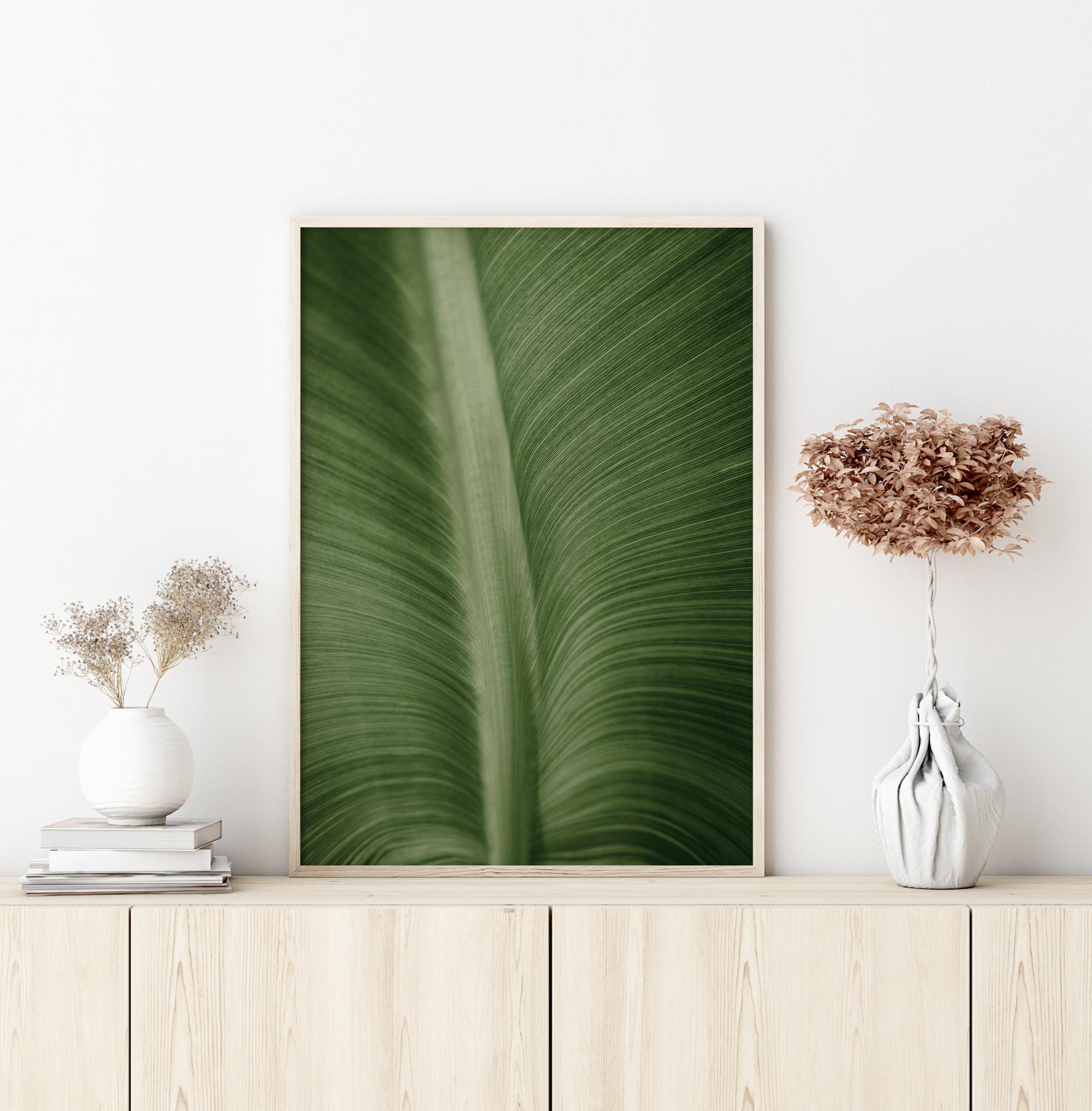 Une affiche macro d'une feuille montrant la structure des veines et de la nervure. De magnifiques verts luxuriants remplissent cette image pour un effet très apaisant. Les fines nervures s'incurvent doucement vers l'extérieur, loin de la nervure centrale épaisse de la feuille. Plongez dans la nature avec ce gros plan.