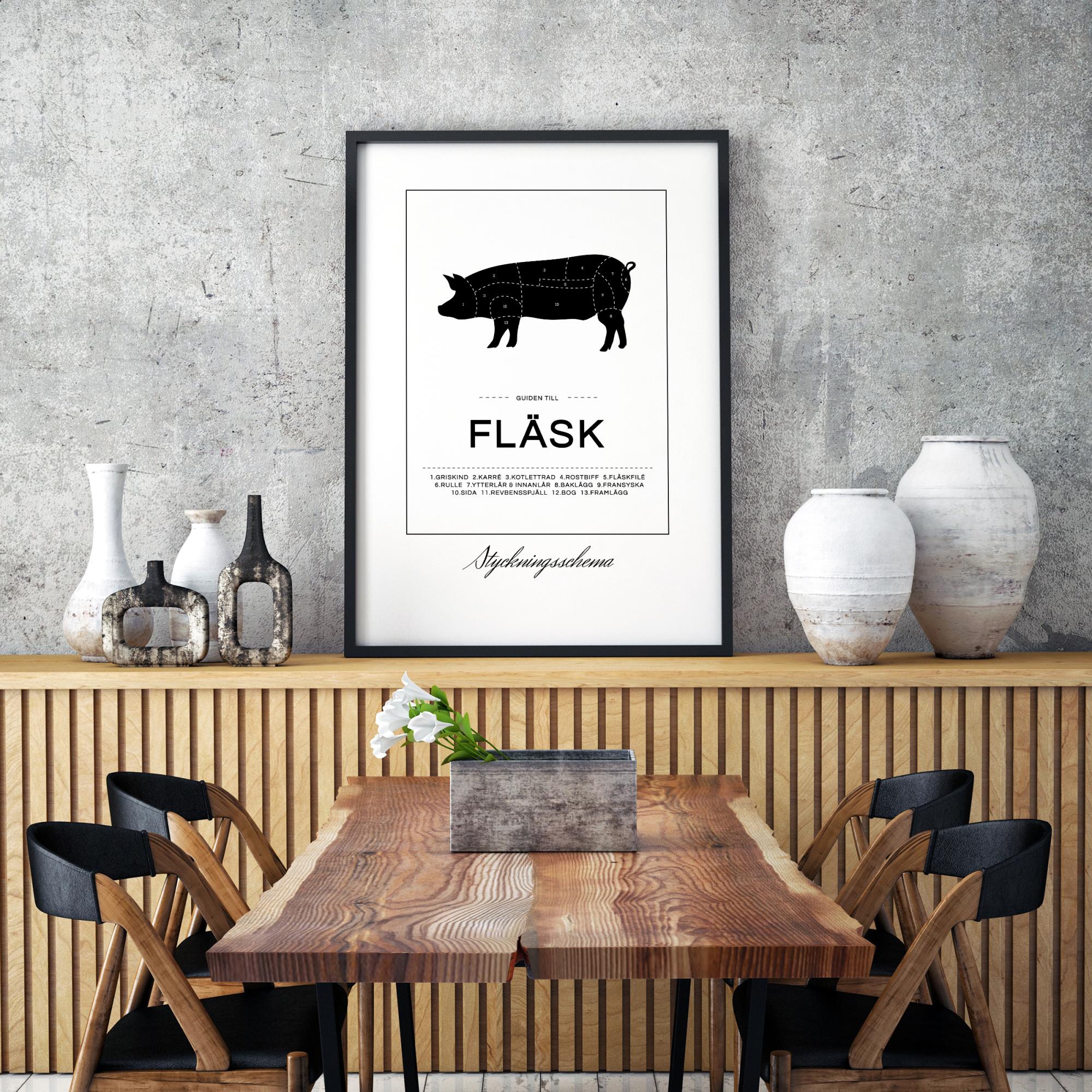 Le poster de schéma de découpe de porc est imprimé dans notre propre studio de prints sur un papier premium de 230 grammes qui est certifié FSC et résistant au vieillissement. Nous avons choisi l'épaisseur robuste et la surface mate parce que cela donne une belle affiche sans réflexions et a une sensation de qualité. Comme nous imprimons le produit nous-mêmes, cela réduit également notre impact sur l'environnement.