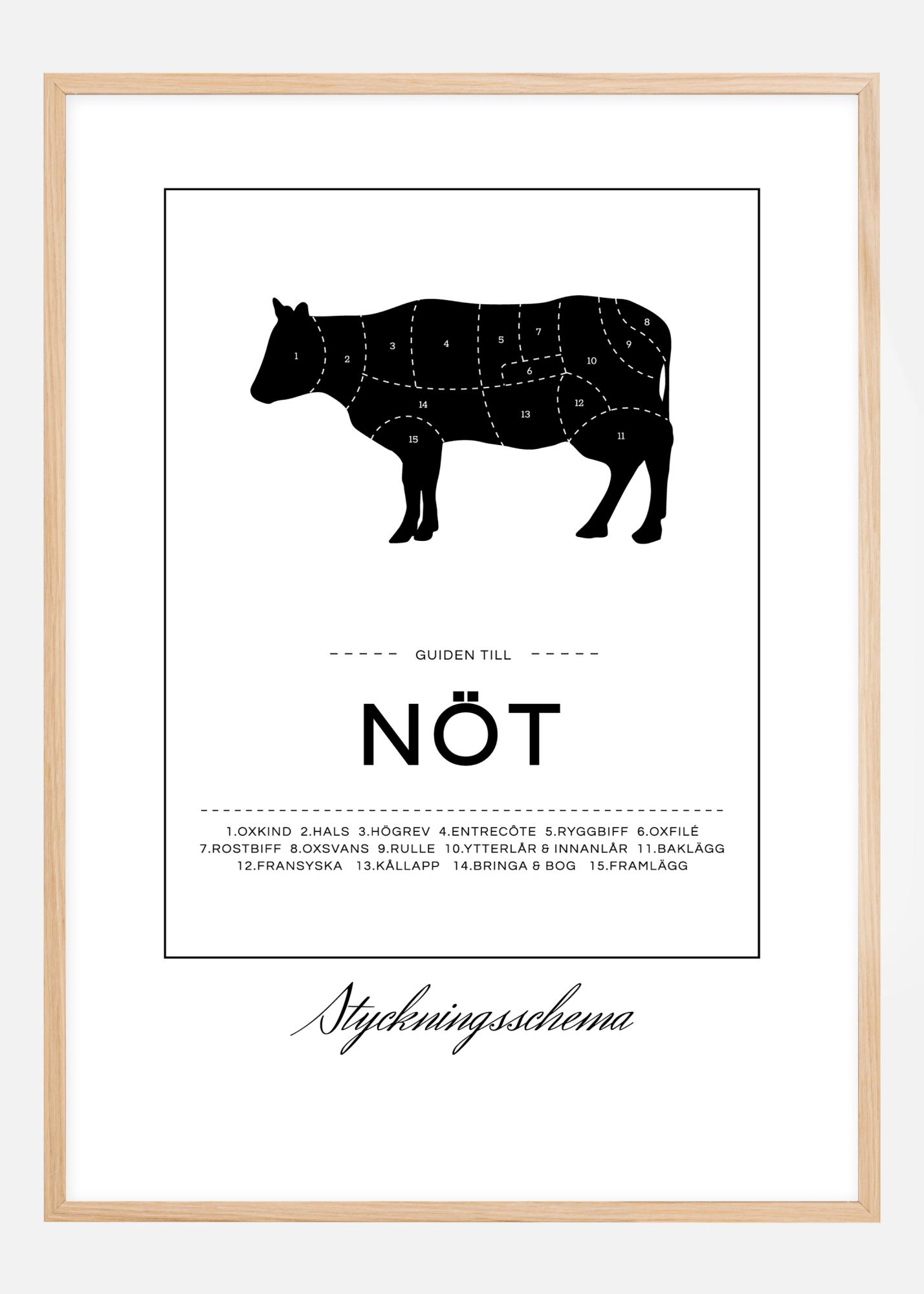 Un schéma de découpe n'est pas seulement pour les bouchers professionnels ! Cette élégante affiche présente un motif représentant une vache noire divisée en marquages indiquant d'où proviennent, par exemple, le rosbif, le roulé et la bavette. Sous l'image se trouve le texte "Le guide du bœuf" accompagné d'une liste numérotée des différentes parties. Autour du motif court un mince rectangle et sous le rectangle se trouve un print avec le texte "Schéma de découpe". Le design noir et blanc se marie parfaitement avec un cadre argenté ou un cadre de votre couleur préférée. Le poster est disponible dans plusieurs formats différents, vous permettant de trouver facilement celui qui convient à votre cuisine.