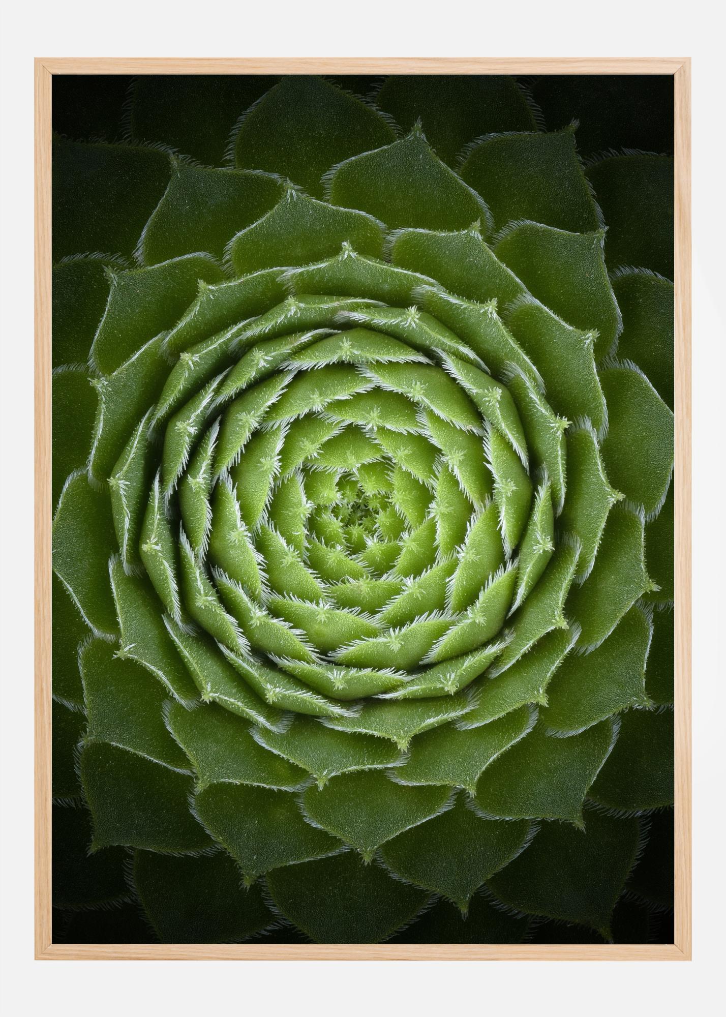 Une affiche en gros plan d'une succulente. Des feuilles d'un vert éclatant se déploient en spirale en forme de rose. Les sommets de chaque feuille de la plante sont très détaillés et de minuscules pointes blanches sont visibles lorsque vous regardez tous les anneaux. Une jolie affiche d’un vert éclatant.