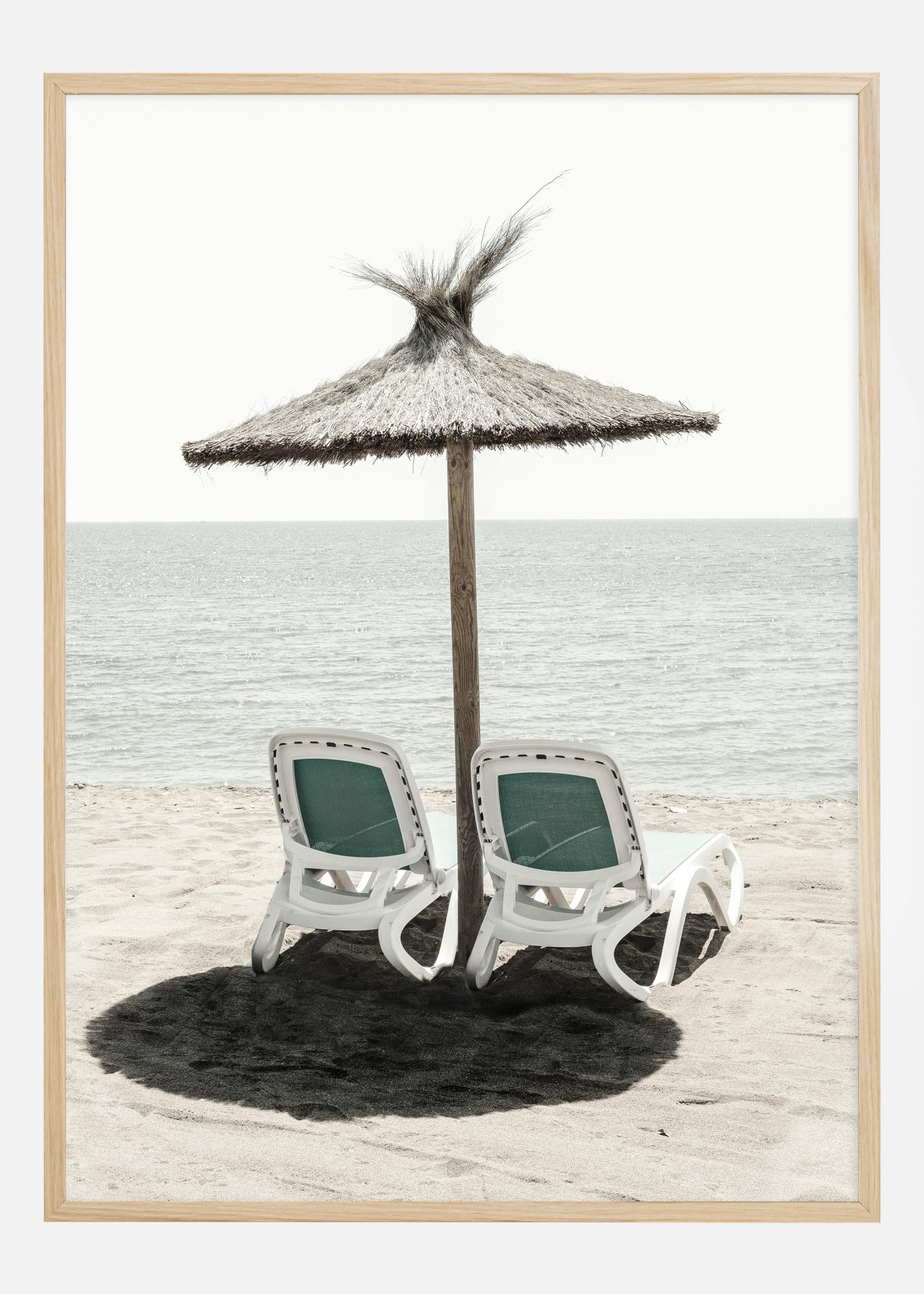 Laissez-vous emporter par le son des vagues et la sensation du sable chaud avec cette affiche apaisante. Deux chaises longues vides sous un parasol en paille vous attendent invitantes sur la plage, avec l'horizon de la mer en arrière-plan. Cette scène paisible est une expression de détente et une évasion du quotidien.