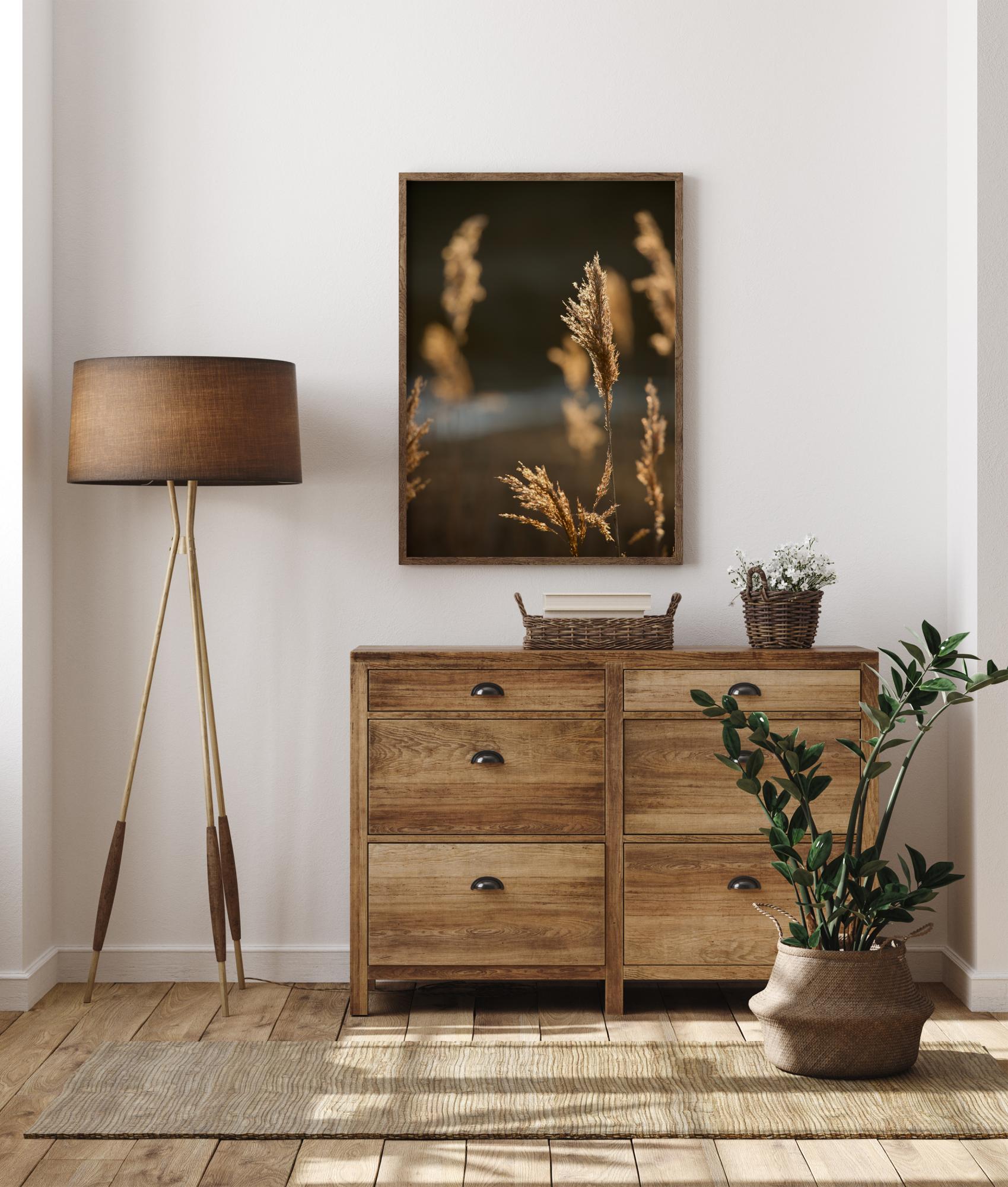 Une affiche estivale de soleil sur un champ. Des épis d'herbe en gros plan se balancent dans une brise d'été. Ils captent la lumière dorée du soleil, qui se reflète également sur la rivière au loin. Profitez de cette douce image qui ramènera l’été lorsque vous l'accrocherez chez vous.