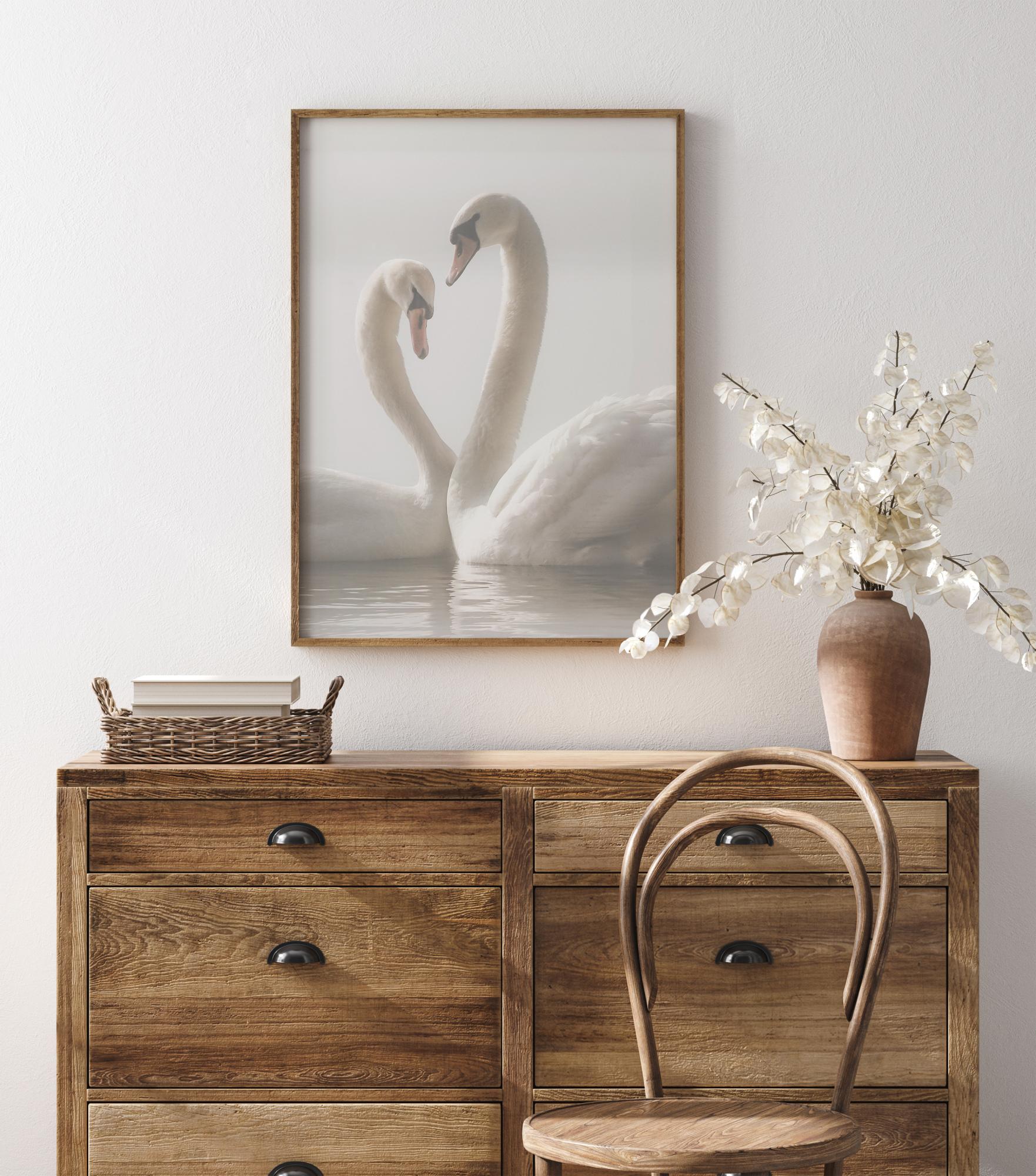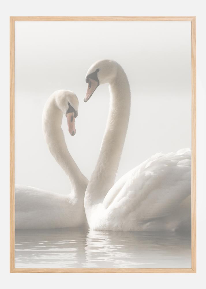 Un poster romantique de deux cygnes nageant ensemble. L'éclairage doux apporte calme et sérénité à cette œuvre. Les cygnes glissent l'un vers l'autre et leurs cous se relèvent pour créer une forme de cœur. Ressentez l'amour dans cette charmante affiche.